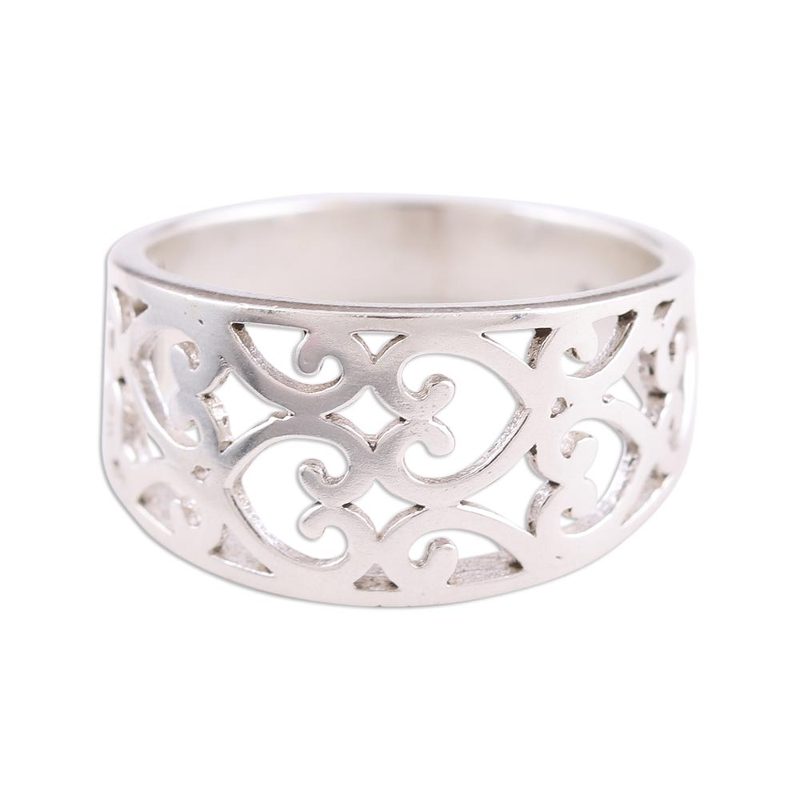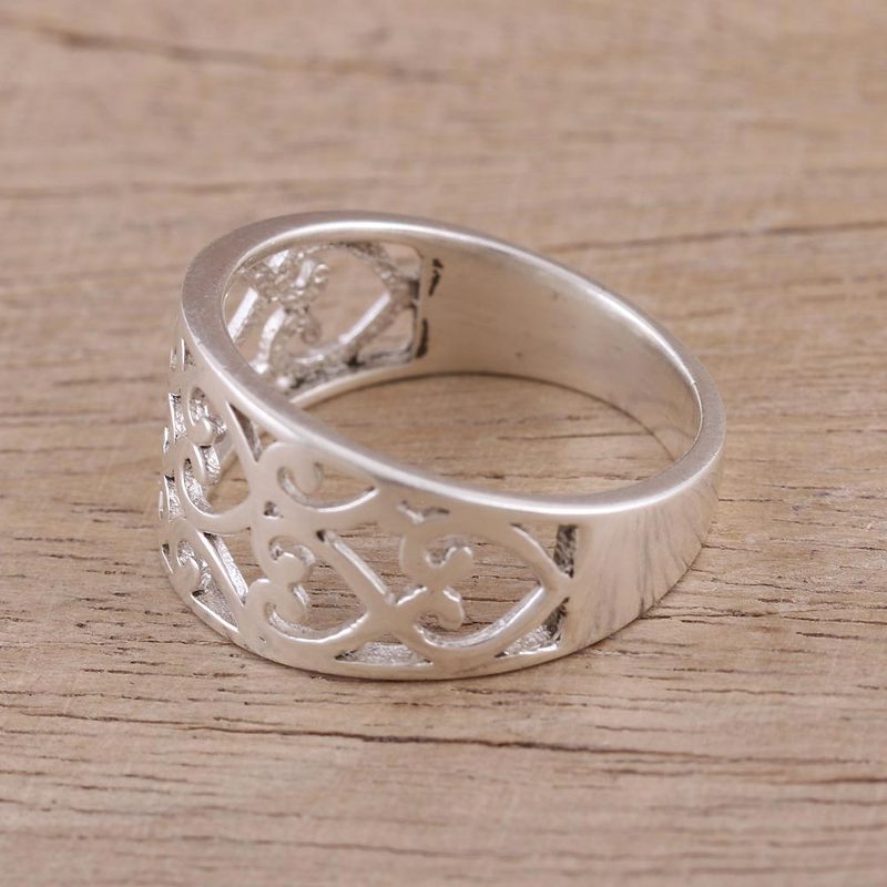 Artisan Aparna designs a simple but elegant band ring that is ideal for all occasions and styles. Crafted expertly by hand in India, the ring features pretty heart motif jali openwork that decorates the crown beautifully. A high polish finish accentuates the luxurious design of timeless appeal.