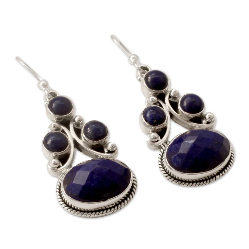 These rich blue earrings are stunning because of the subtle variations of color in the stone. The round silver dots framing the circle add interest but arent too fussy or overwhelming and enhance, rather than detract from the beauty of the lapis stone. These earrings are sufficiently classic and a tad dressy but not overly staid nor drab. I have other pieces by Neeru Goel and hope to purchase more when on sale.