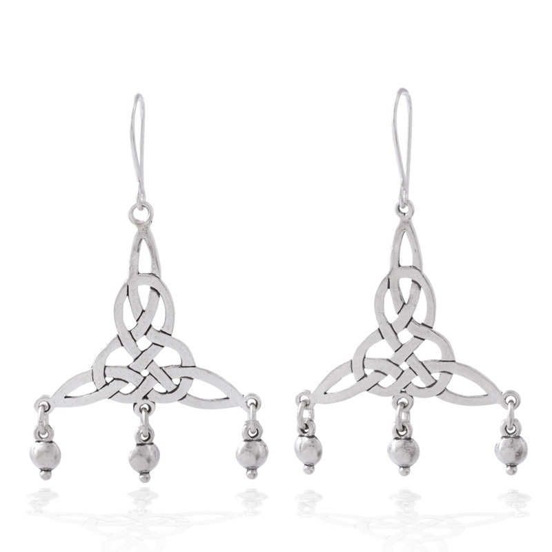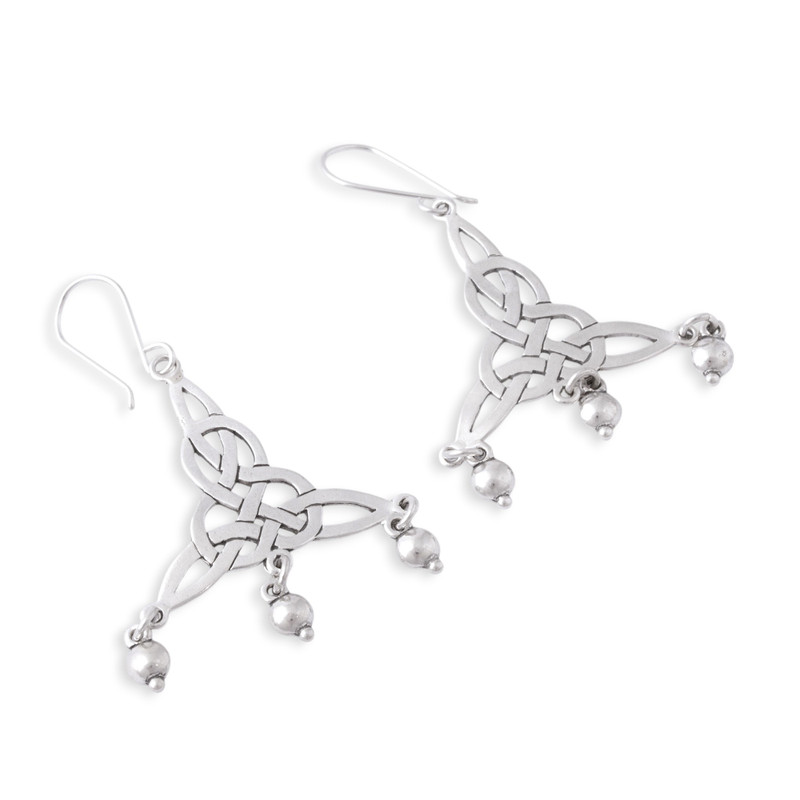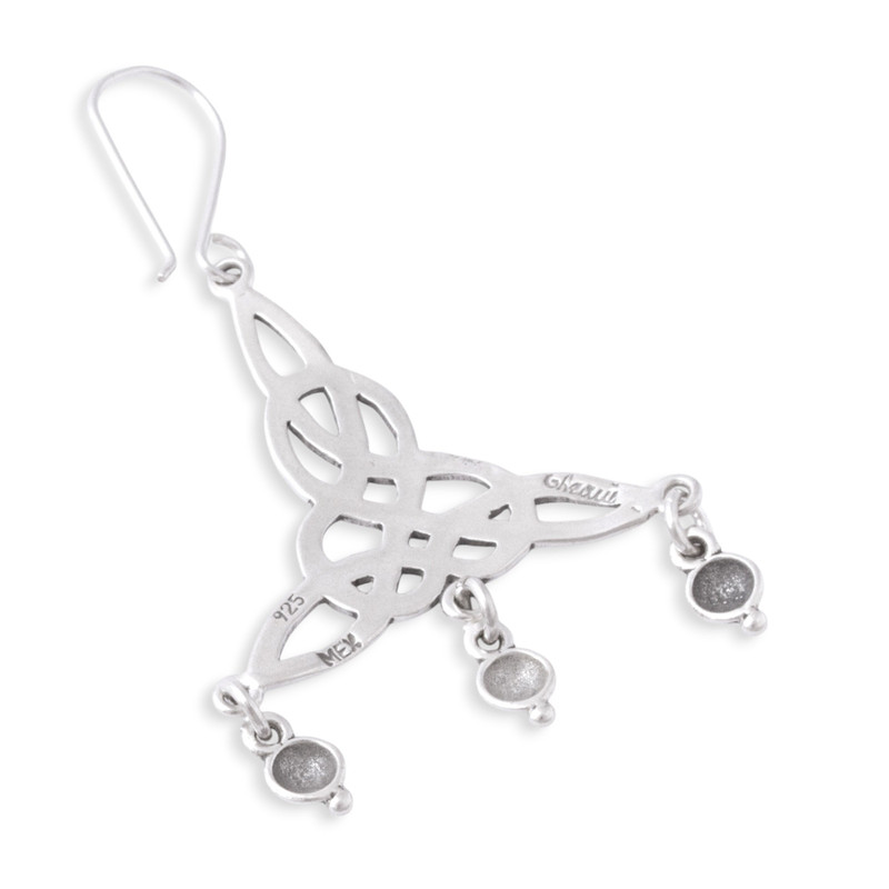 Wonderful knots that evoke Celtic motifs are handcrafted of sterling silver with openwork designs and three petite baubles that dangle from each one. Adorning the ears on hooks, these chandelier earrings from Mexico feature an original design by Gianluca Anzani, who says "My work is the value and effort that I put into each of the pieces that I create." He accentuates the earrings with a shimmering combination of finishes.