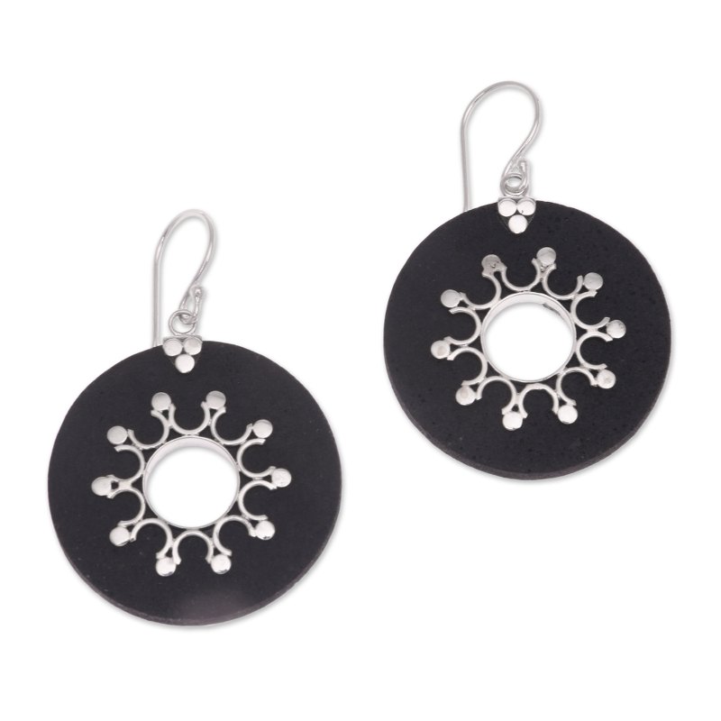 Backed by our 100% Happiness GuaranteeEvoking a luminous sun peeking through the clouds, Balinese artisan Rupadana creates these stylish earrings. Lava stone discs frame intricate sterling silver rays, marking the sun's shape. Lava stone is known for promoting inner calm.