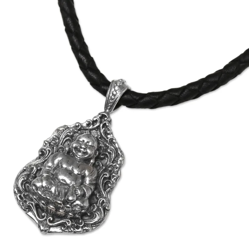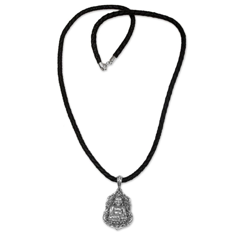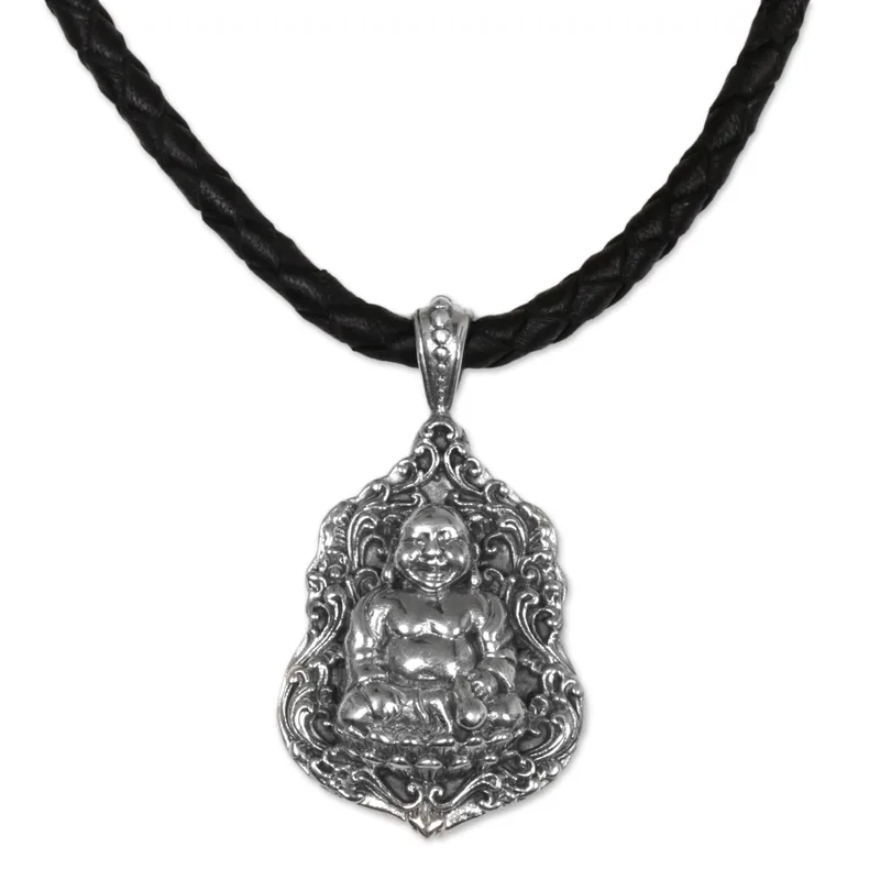 Pu-Tai is the given name for the iconic laughing Buddha, said to have possessed a charismatic and magnetic personality. Indonesia's Made Sudiari pays homage to Pu-Tai, crafting his image from sterling silver in the pendant of this necklace, hanging it from a braided leather cord.