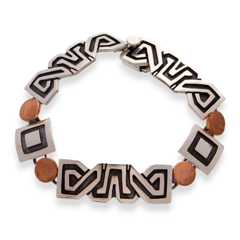 Backed by our 100% Happiness GuaranteeMaria Belen Nilson finds inspiration in the ornate friezes that adorn pre-Hispanic pyramids in Mexico. Her original design is cast of sterling silver featuring oxidized accents. Each stylized frieze is separated by a blazing copper sun.