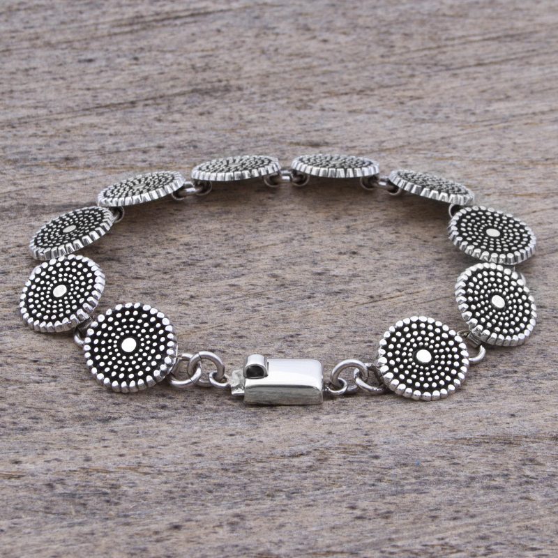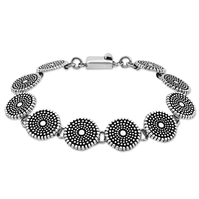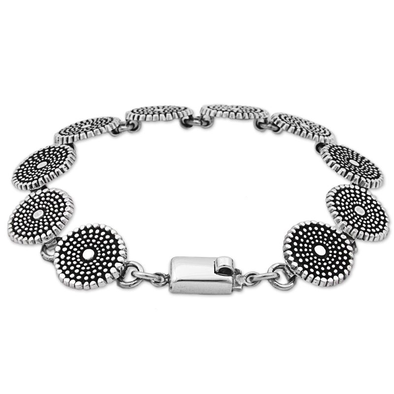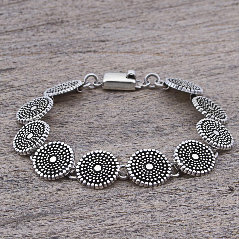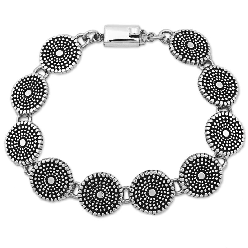 By Angel Ortiz, this link bracelet features circular dot motifs made from Mexico's legendary sterling silver mined in Taxco. Modern and elegant, this bracelet makes a great accessory for any outfit.