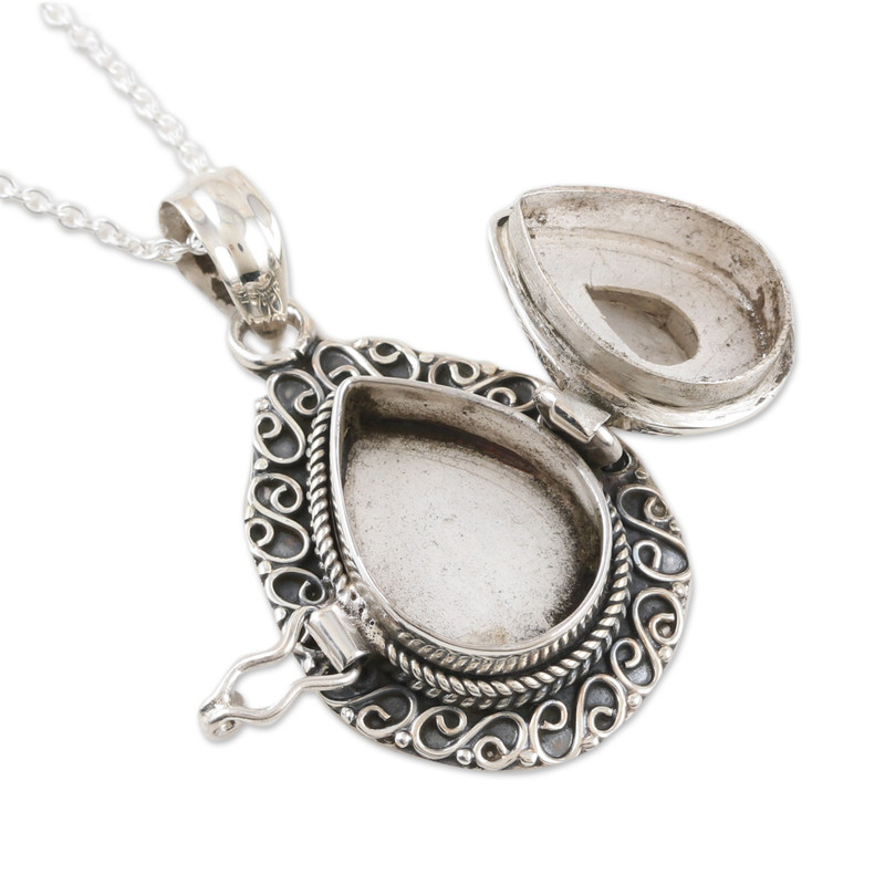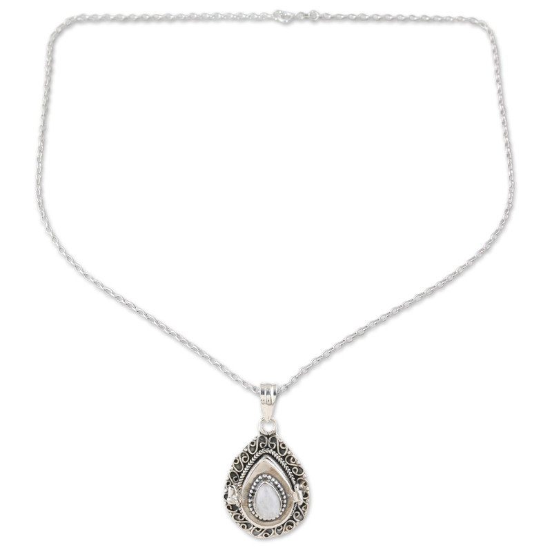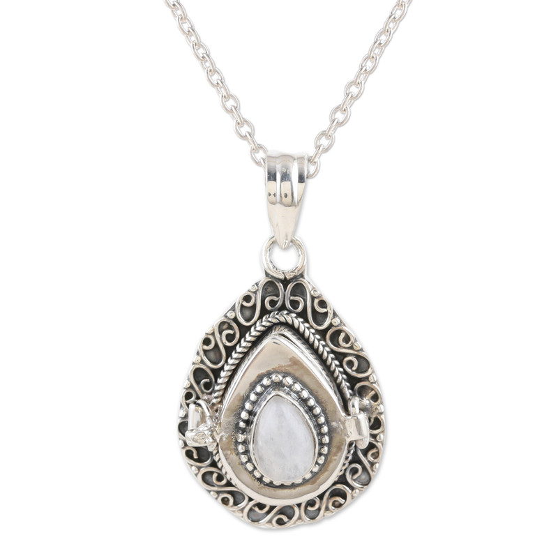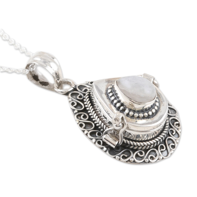 Crafted in India by Rakesh Rana, this sterling silver pendant necklace is a tender piece of art featuring a natural moonstone with unique properties. After adding a combination finish to the accessory, the gemstone crowns the design with a luminous accent, attracting peace and health. On top of that, it is also a locket that allows you to carry a little photo or item within.