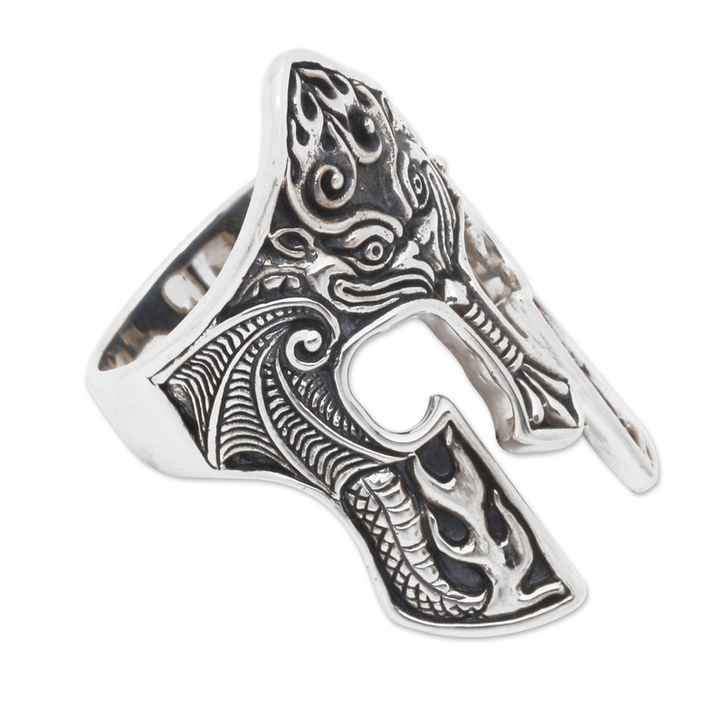 A fierce warrior's mask wraps around the finger, featuring flame motifs and the image of a dragon handcrafted from sterling silver. Designed by Putu Gede Darmawan, this original men's ring is inspired by Brawijaya, the last king of the Javanese kingdom Maja Pahit.
