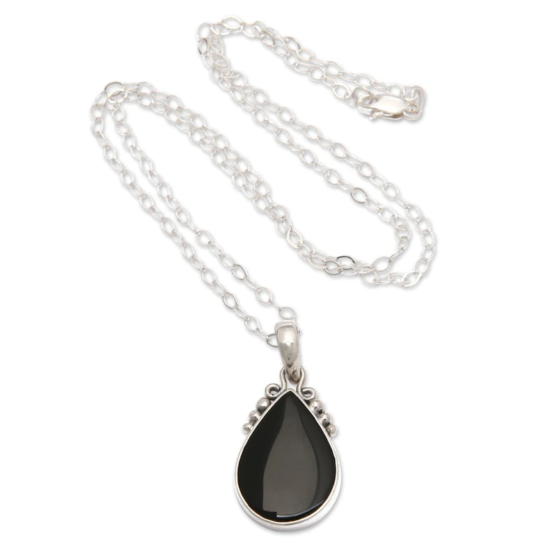Unveil the enchantment of a striking teardrop black onyx stone adorned with petite dot accents stealing the spotlight in a stunning pendant necklace that effortlessly harmonizes a timeless design with contemporary allure. Crafted with precision from sterling silver by skilled Balinese artisans for the Mutiara Collection, this eye-catching accessory is a tangible expression of their genuine passion for both gemstones and the artistry of silversmithing, introducing a layer of sophistication to your jewelry collection.