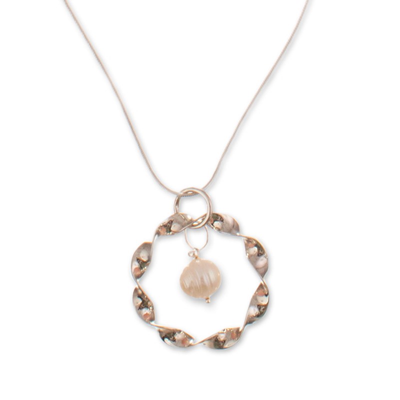 Make an entrance wearing Sandra and Lily's dazzling pendant necklace, exquisitely handcrafted in Peru. A sterling silver ribbon twists into an eye-catching circular form, showcasing a pristine white cultured pearl swaying with grace. Associated with beauty, sincerity and new beginnings, let this pearl connect your inner radiance to the outside world. Complementing all ensembles with elegance, don this stunning work of art for special occasions like weddings.