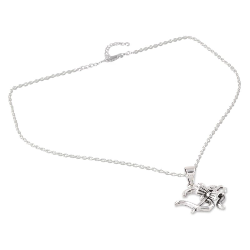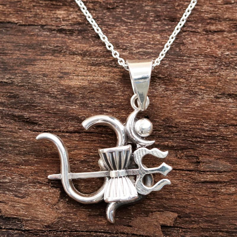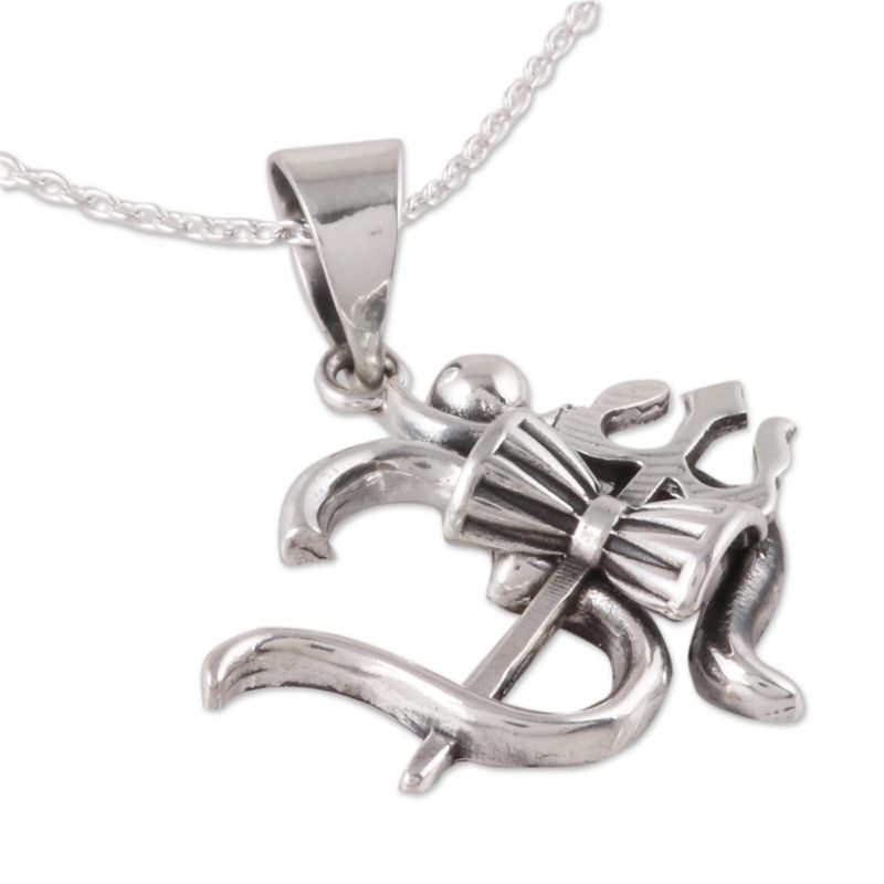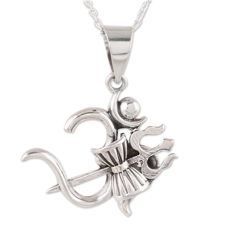 Inspired by the grace of the Hindu god Shiva, Neetu Barathi designs this sterling silver pendant necklace from India. Displayed in front of the omkara symbol for the meditative mantra om, Shiva's trishul, or trident, signifies his control over the earth, sea, and sky while banishing bad omens. The trident is accompanied by Shiva's damaru, or drum, which symbolizes the universe.