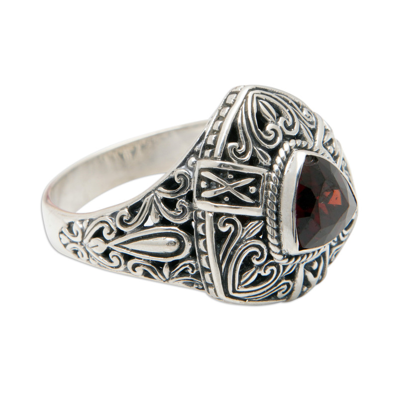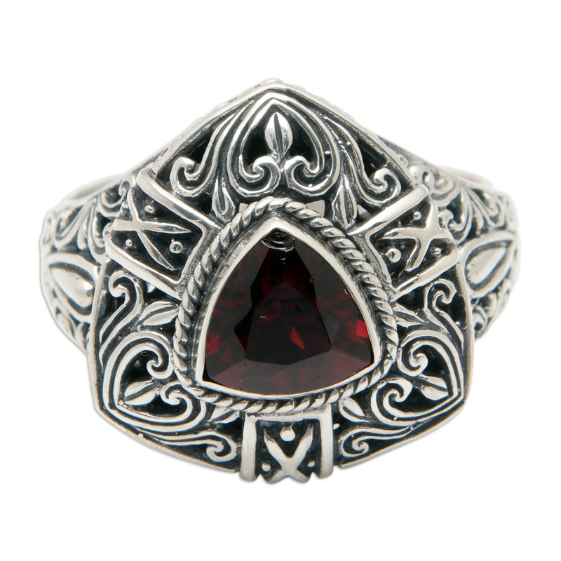 Backed by our 100% Happiness GuaranteeSlip on this breathtaking triangular cocktail ring and leave a lasting impression thanks to the vibrant pop of a fiery garnet stone. Designed by Ketut Udiana, it boasts a sterling silver setting accented by polished and oxidized finishes, perfectly complementing the gem's rich red hue. In this must-have accessory, classic Balinese motifs flow seamlessly from front to band with chic elegance.