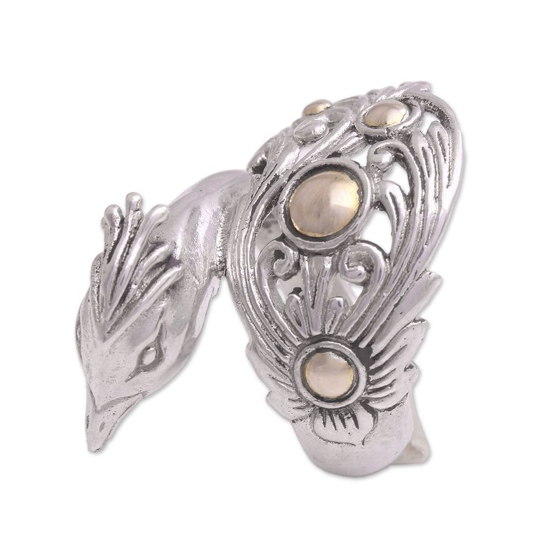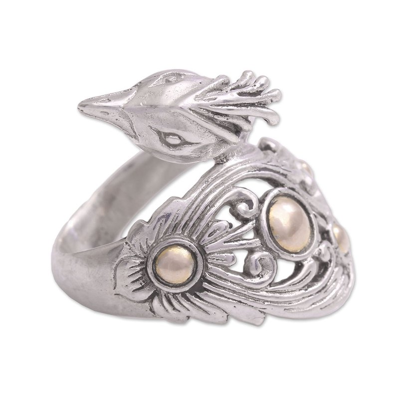 Backed by our 100% Happiness GuaranteeThis exquisite sterling silver cocktail ring is in the shape of peacock, where the head and tail are visible on the front of the hand and the neck wraps around the finger. Artisan Dewa Arimbawa of Bali handcrafts this ring with lovely details, including intricate scroll and open work accented in 18 karat gold to form the peacock's feathers.