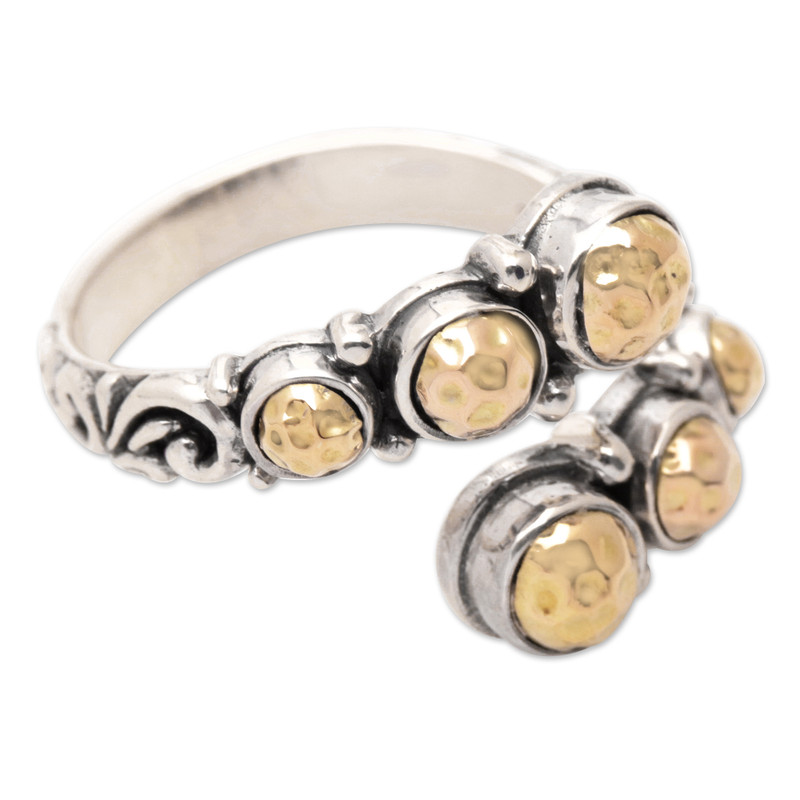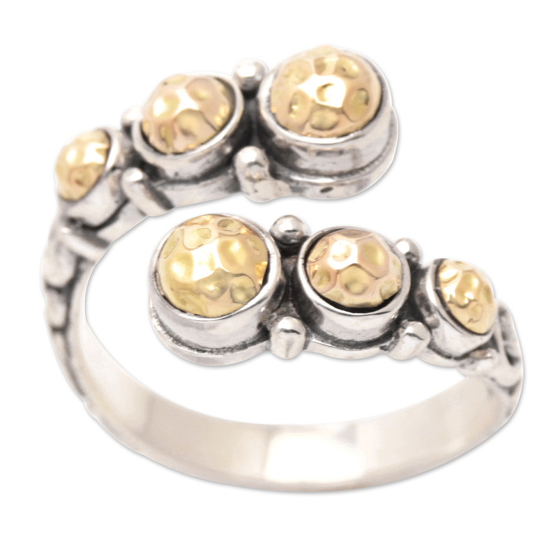 Backed by our 100% Happiness GuaranteeIn a very clever and original design, Balinese artisan Asri Paramita uses 18k gold-plated accents with a beautiful hammered finish instead of gemstones to embellish a wrap ring that goes with virtually any look and style. The delightful ring is made from sterling silver with swirl motifs and a combination finish.