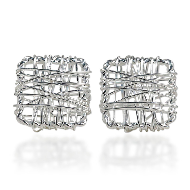 Lalana crafts a bright and versatile pair of stud earrings with modern Thai style. The design features sterling silver strands wrapped around and around petite open squares for an appealing textured look that can work with almost any outfit.