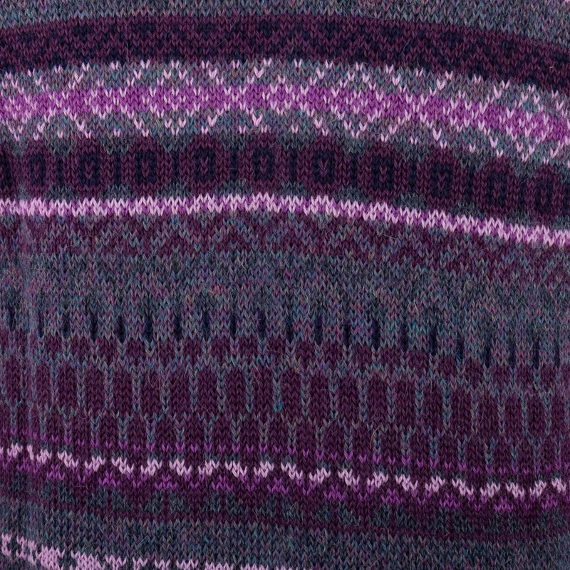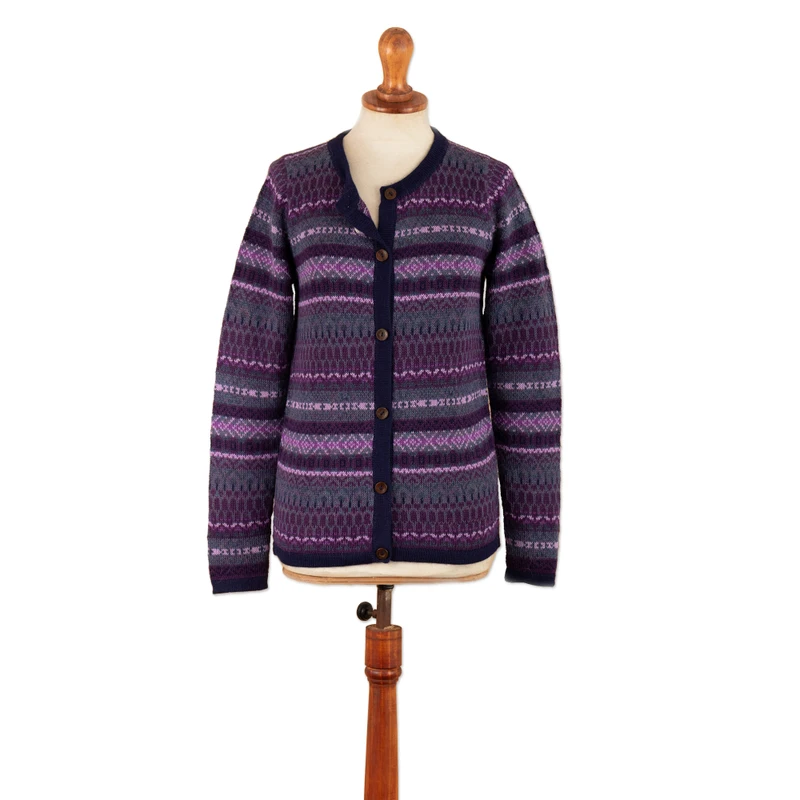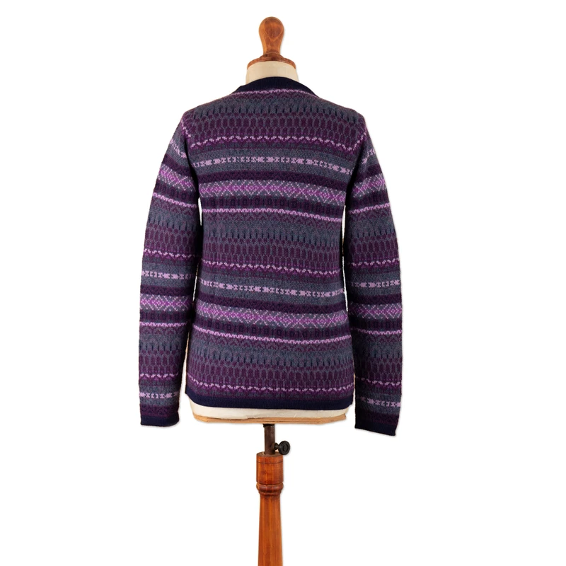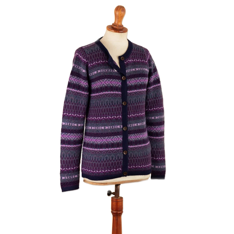From the ancient lands of the Empire, Fernando Cano's newest design captures the bewitching beauty of the Andes in the lovely textile that composes this garment. Made with a geometric Inca pattern, this 100% alpaca cardigan—from Peru—features long sleeves and a comfortable crew neck, accented with a buttoned closure that combines masterfully with the purple base hue.