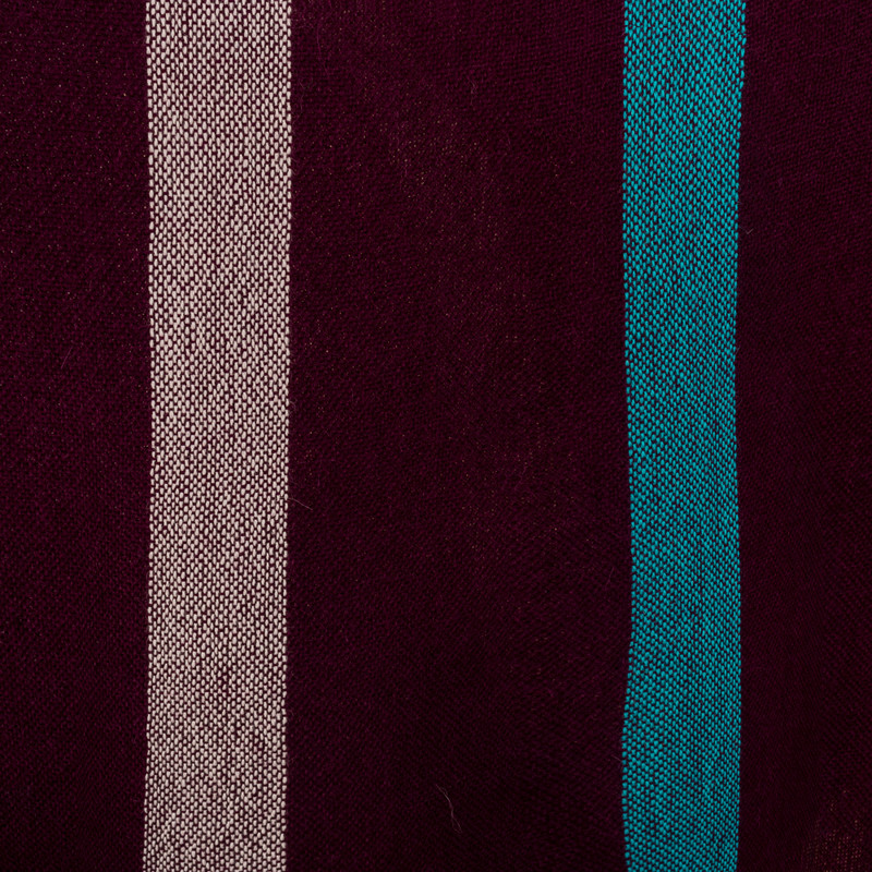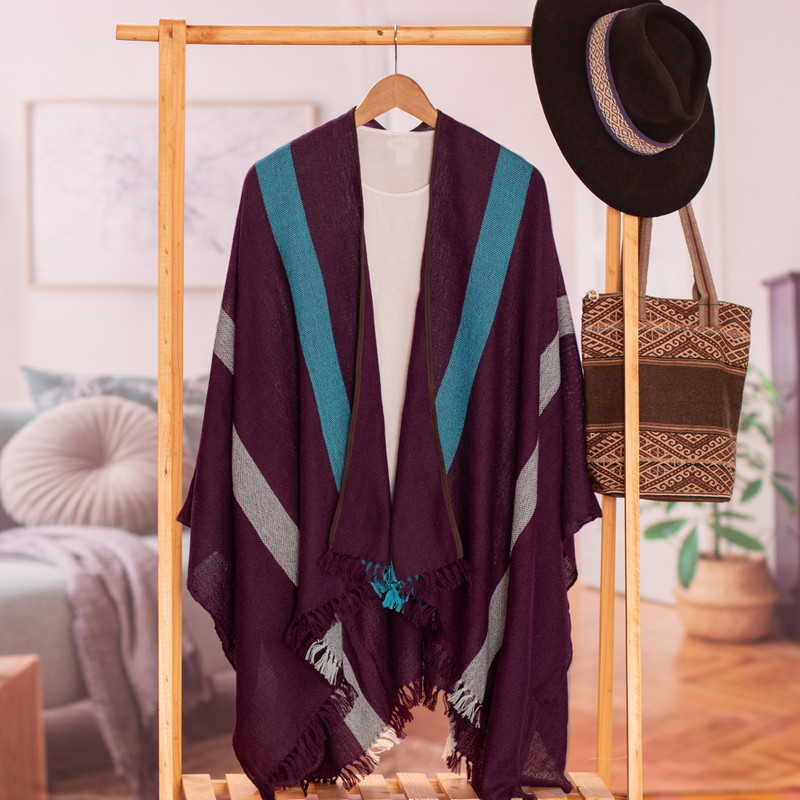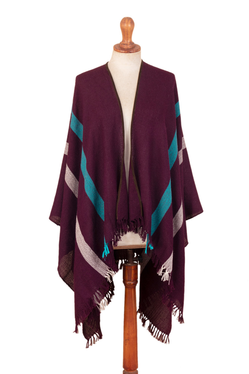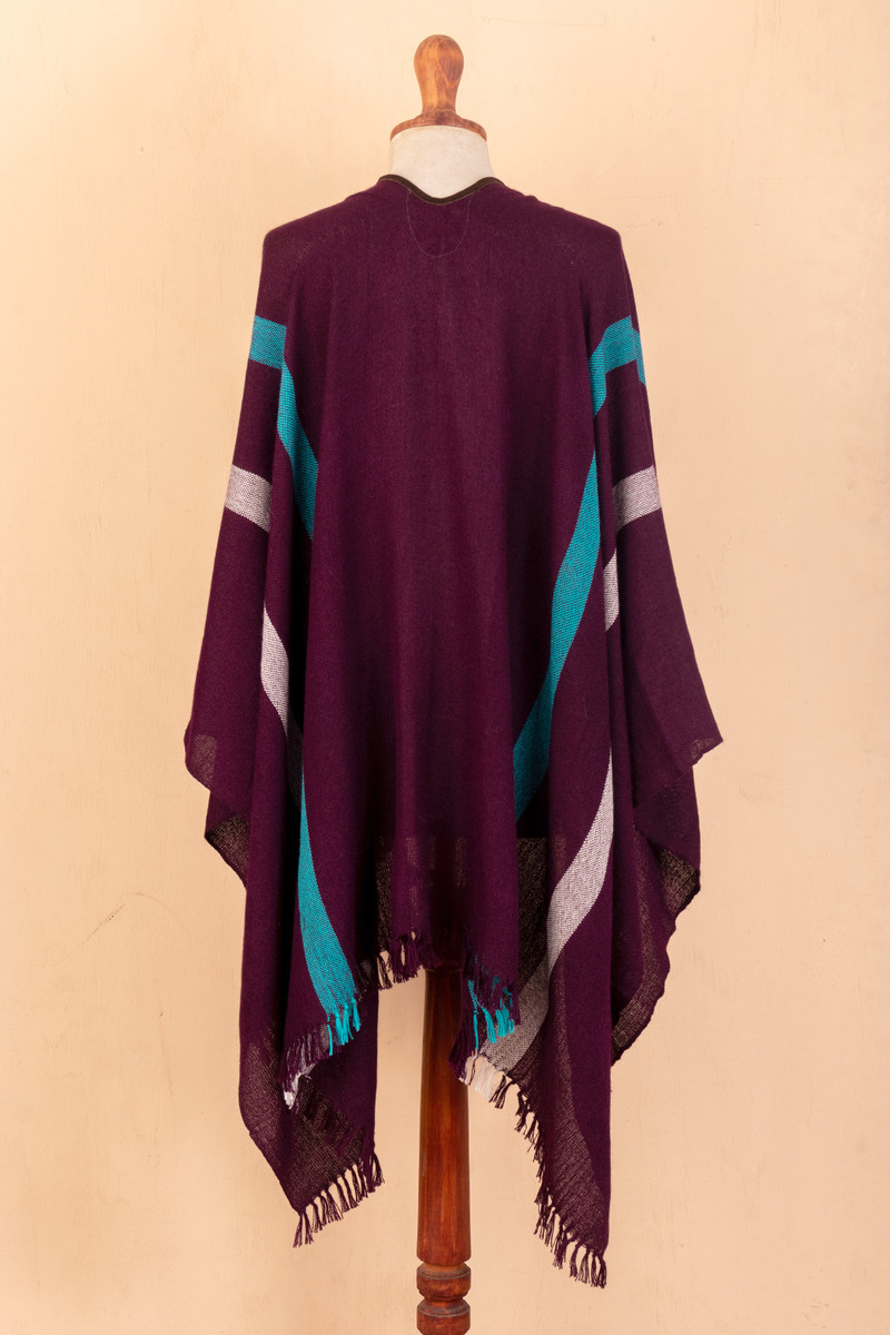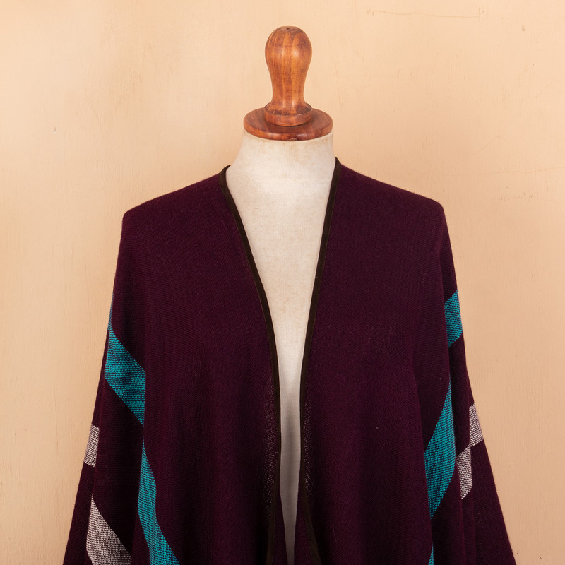 Experience unparalleled comfort and style with this exquisite ruana woven from 100% baby alpaca. Peruvian artisan Stefano Basso's lightweight yet warm garment boasts an elegant eggplant background adorned with striking cerulean and white stripes. The suede trim and delicate fringe add a touch of sophistication, making it the perfect versatile accessory for your winter wardrobe.