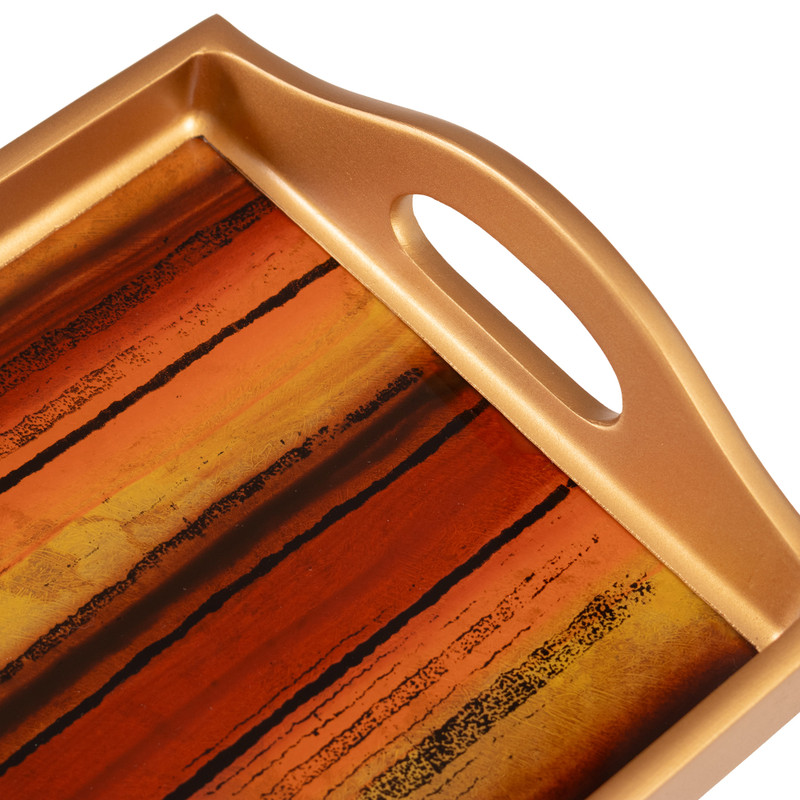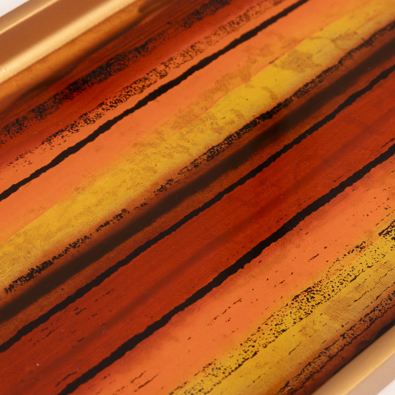 According to Peruvian artisan Flora Polo, the striped design of this tray is inspired by the ceramics and textiles of the ancient Inca, painted by hand onto the reverse side of a rectangular glass panel with a contemporary aesthetic. Evoking the beauty of a desert, the tray is completed with wood sides and handles with a gold-tone finish.
