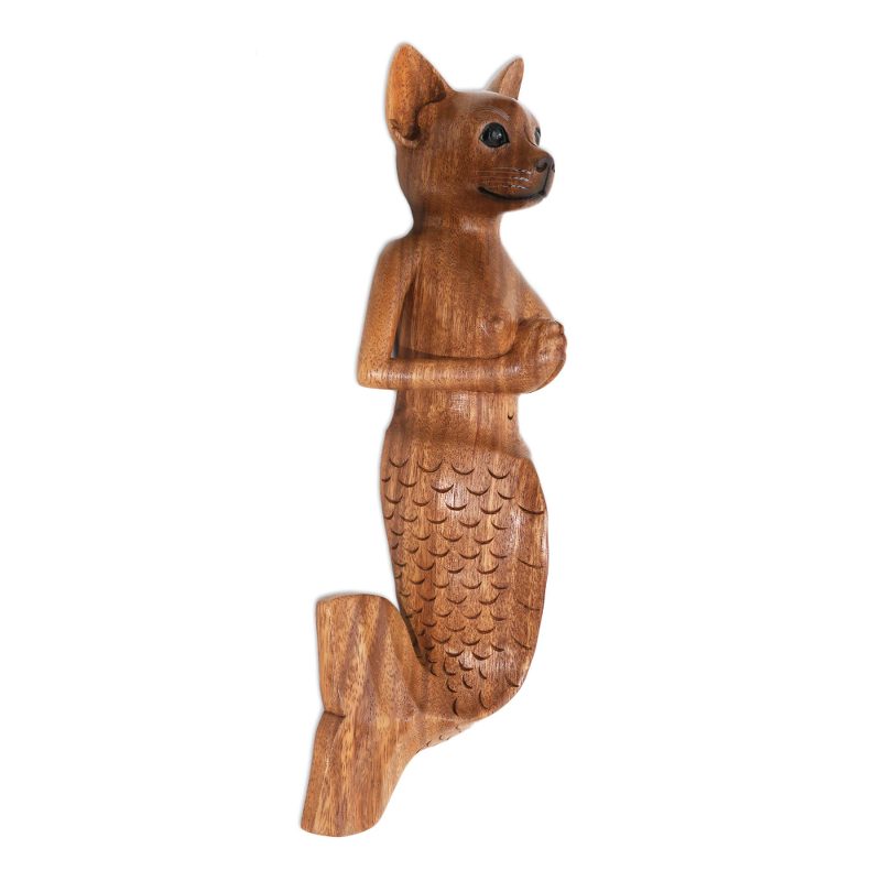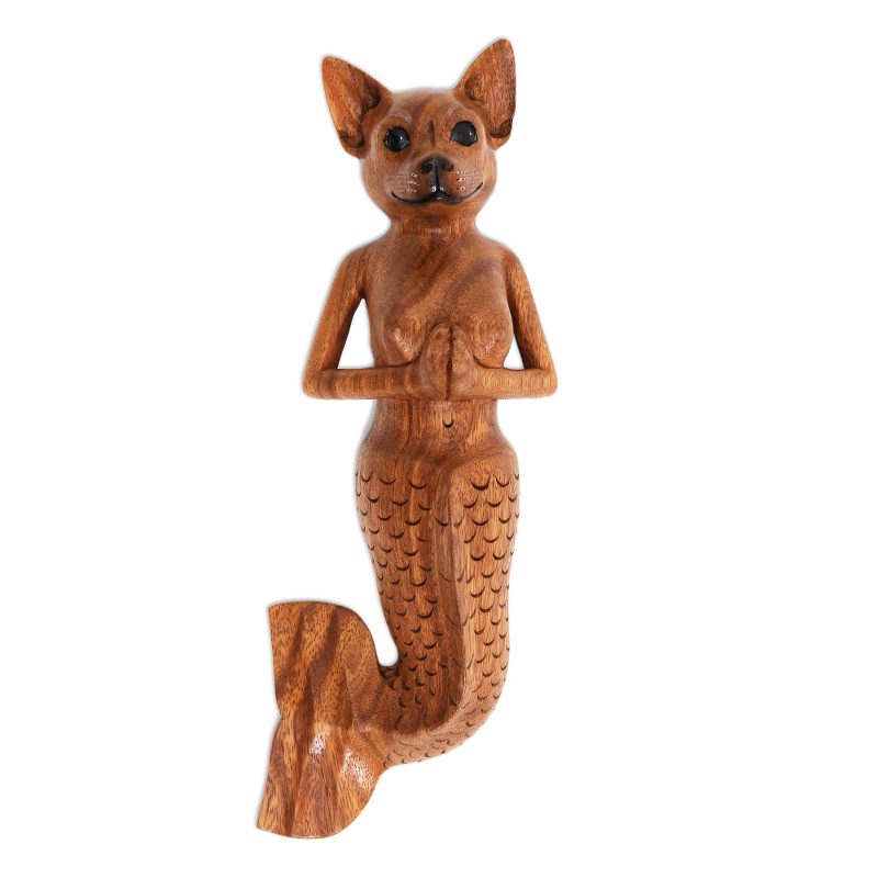 Hands held together in reverence, a mystical mermaid with the head of a dog makes the perfect addition to your home or beach condo. Balinese artisan Nengah Sudarsana creates this sculpture, carved by hand from suar wood with a rich natural grain.