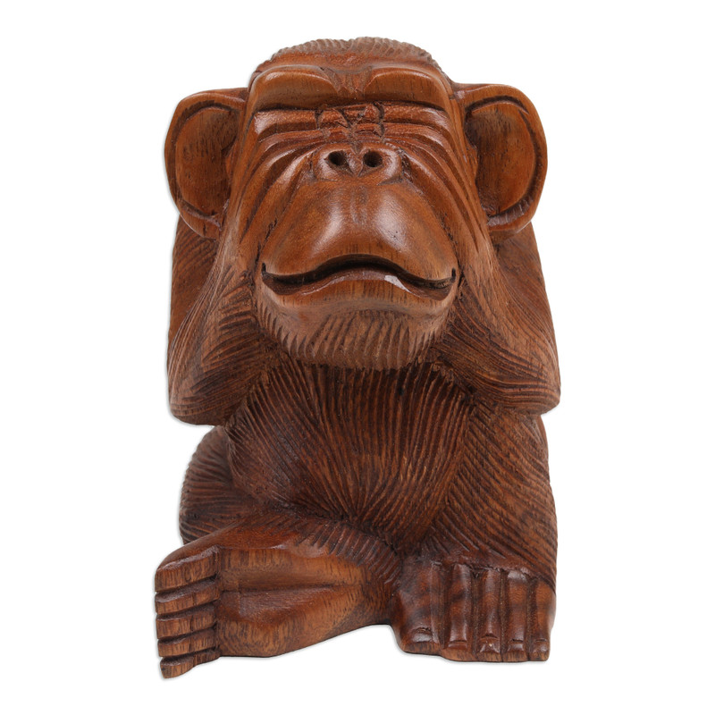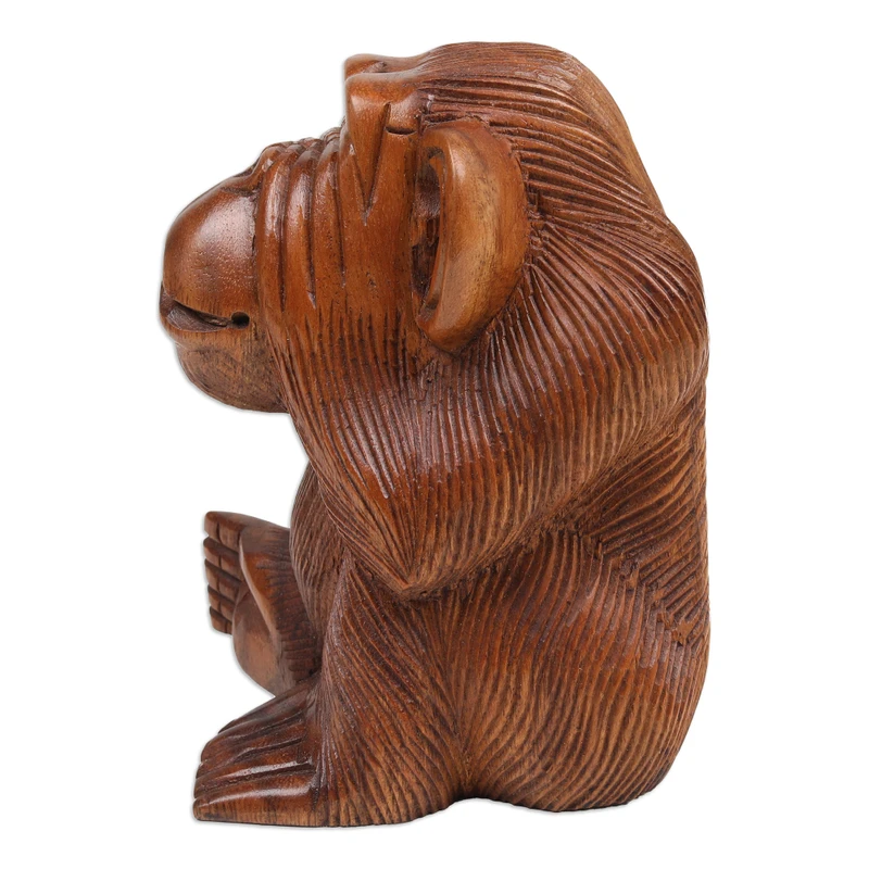 This cheeky young orangutan has done something naughty to have some fun. Perfect for a whimsical decoration with a touch of tropical beauty, Balinese artisan Wayan Rendah's newest sculpture is exquisitely made from suar wood to enrich the natural aura displayed in each hand-carved detail composing the piece. Crafted as an homage to these wondrous islands, the piece is also polished.