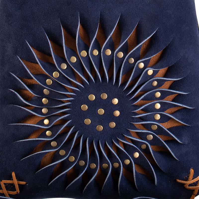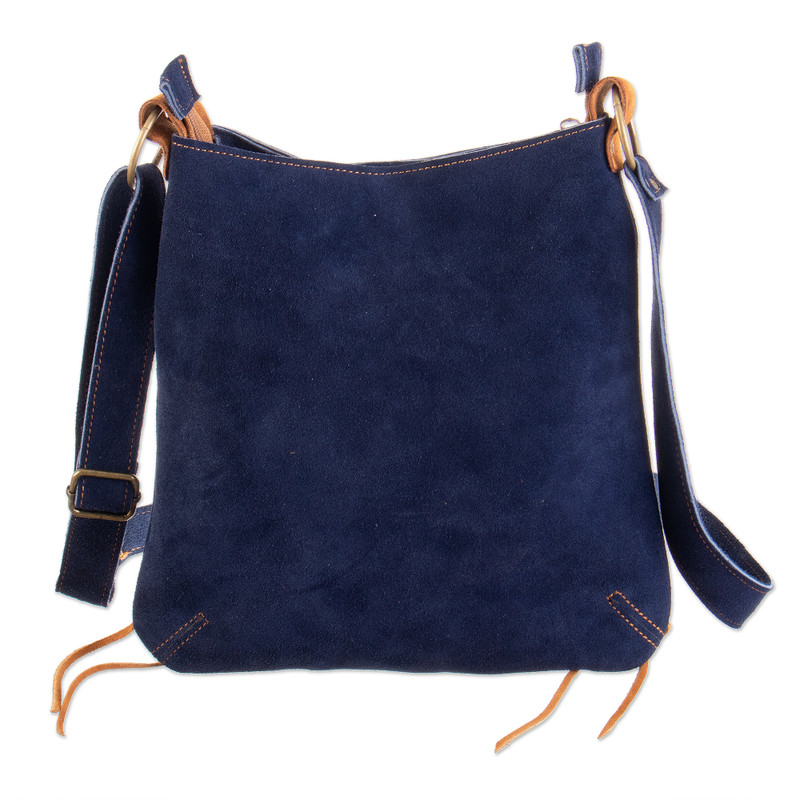 Backed by our 100% Happiness GuaranteePeruvian artisan Lida Evaristo crafts this stylish soft suede bag with a spiraling cutout design accentuated by metal studs on the front and contrasting laced leather cords at the corners. Drape over the shoulder or wear across the body, the vintage inspired bag features a zipper closure, lined interior with a single zipper pocket for storing small items and an adjustable strap.