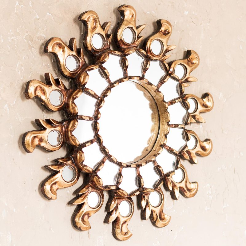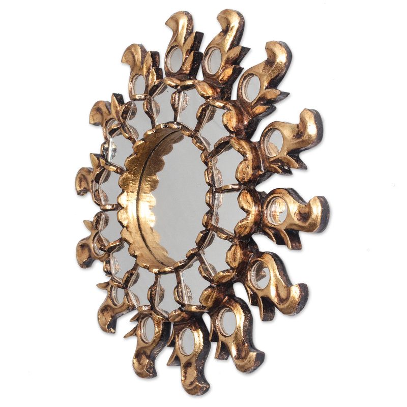 Inspired by the style of reverse-painted glass, elaborate wall mirrors like this one were born. Peruvian artisan Gliseria Soto handcrafts this mirror from mohena wood, gilded in bronze for a golden hue. Petite, circular mirrors are framed by fiery tendrils that decorate the exterior. The round mirror at the center is surrounded by an array of mirrored pentagons.