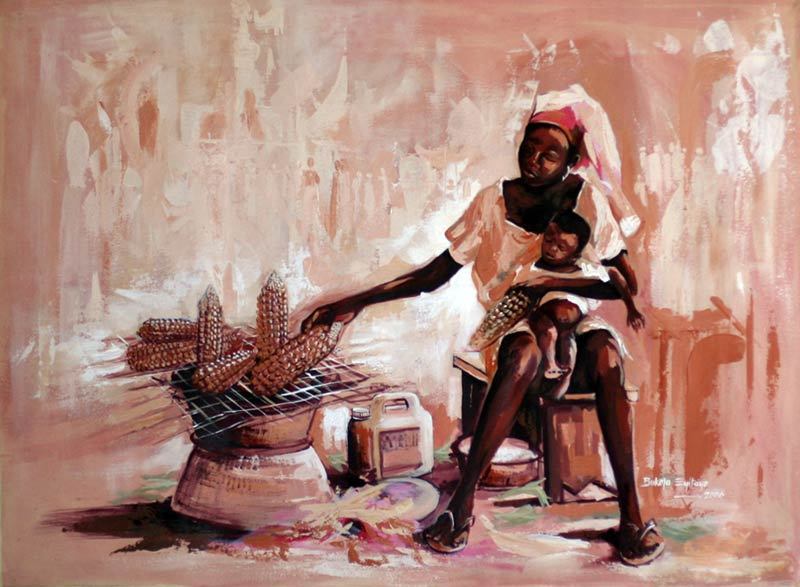 Sitting next to a coal stove, a woman roasts corncobs while she holds her baby on her lap with one arm. Bukola Eyitayo paints with sensitive artistry, honoring their plight through delicate brushwork. "No matter how bad an economic situation could be, people somehow will find a way to survive," Eyitayo reflects.