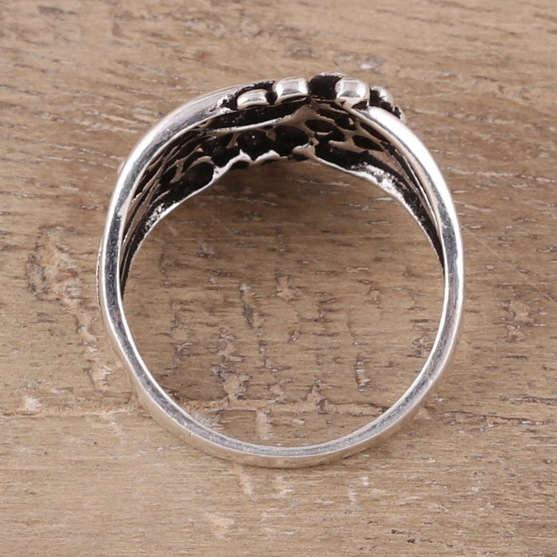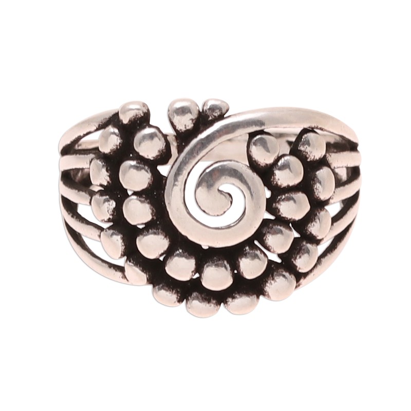 Designed by Bhavya Jain in India, this band ring is crafted of sterling silver, featuring a central swirl pattern that is surrounded by combination-finish dot motifs. Local artisan craft this ring with a modern flair.