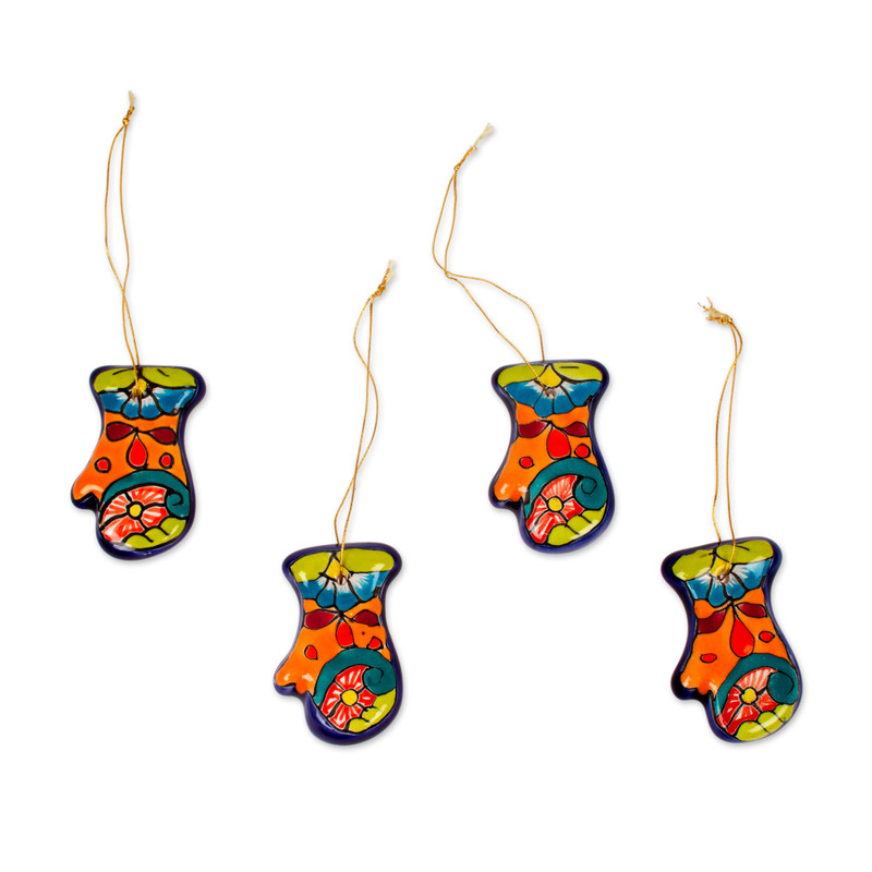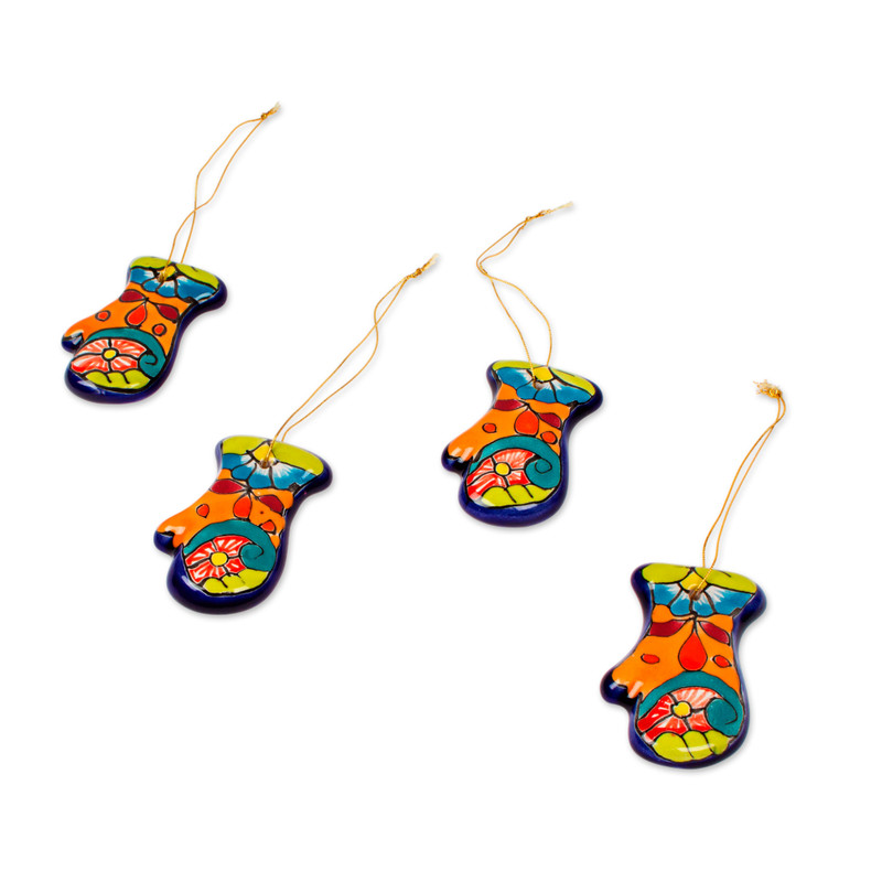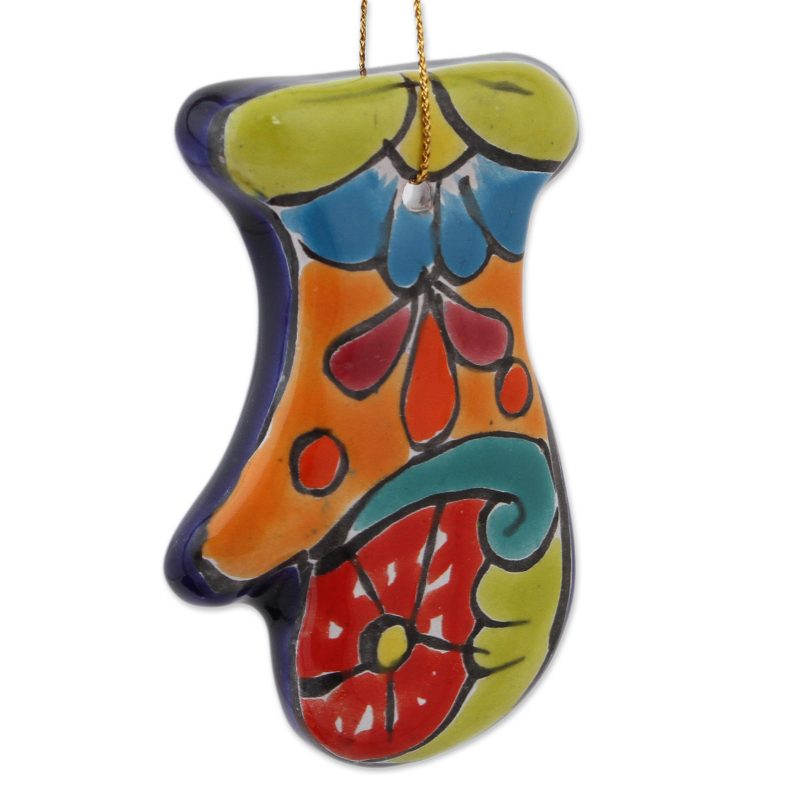 By Mexican artisan Juana Ponce, these ornaments depict two mittens that add the beauty of Talavera handicrafts to your tree this holiday season. Crafted from ceramic, each ornament features colorful floral motifs that are diligently painted by hand.