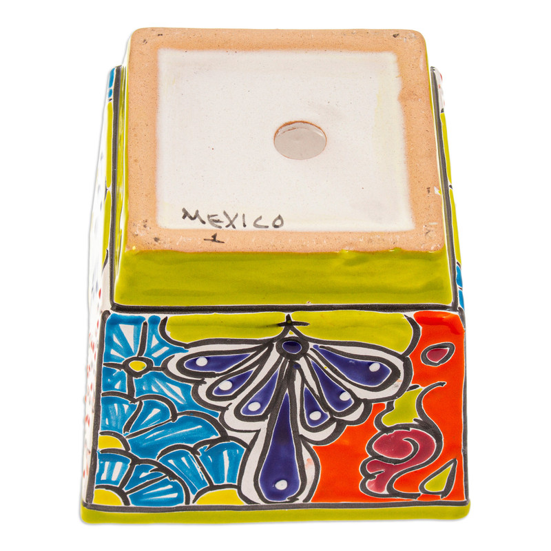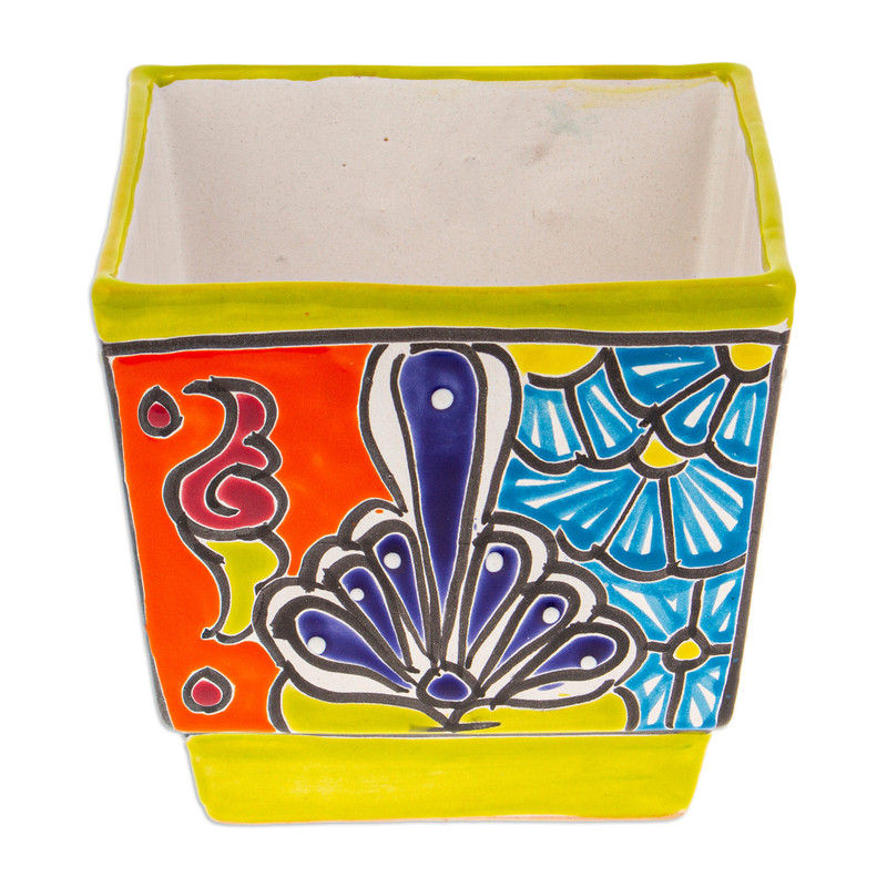 Backed by our 100% Happiness GuaranteeFour sides in a Talavera style form an exquisite ceramic flower pot by Juana Ponce from Mexico. As an expert in this ancient technique, the artisan embellishes the accessory with hand-painted floral details that transform the piece into a hacienda accent featuring a vivacious chartreuse hue as the main color. On top of that, the item comes with a hole that allows for drainage.