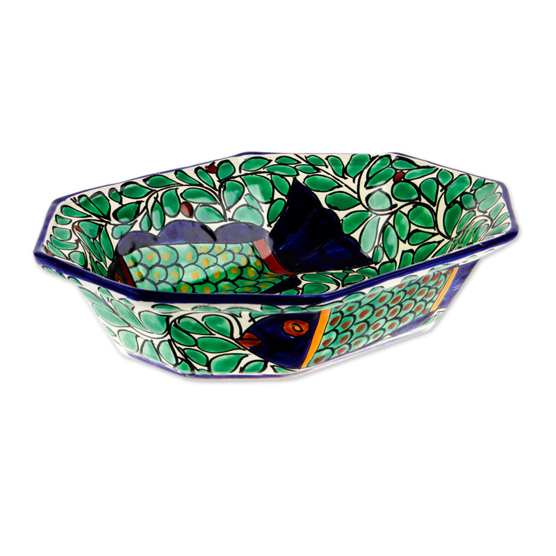 Delivery EstimateMake your next dinner party unforgettable with this show-stopping Talavera ceramic serving bowl. Bursting with lively colors and adorned with bold fish and leaf motifs, it transforms your table from ordinary to extraordinary in an instant. Designed by Ivan Martinez, this exquisite accessory is inspired by the rich tradition of Mexican Talavera pottery, combining functionality with artistic flair.