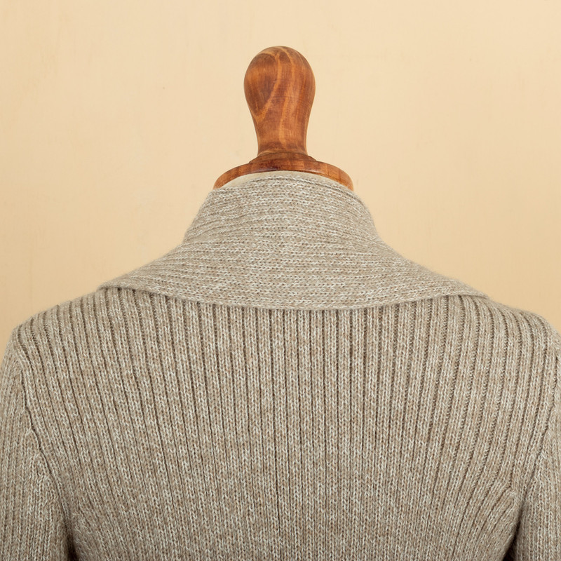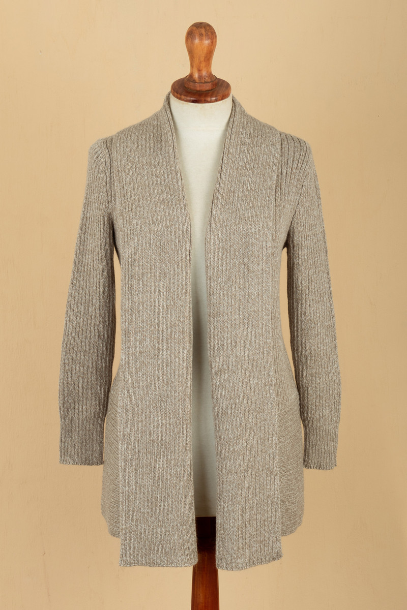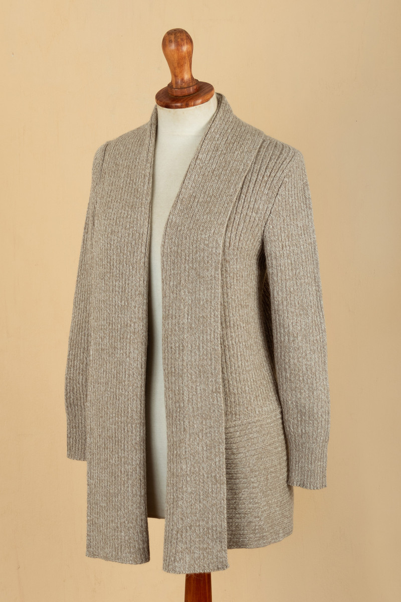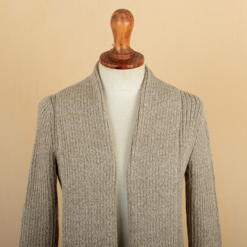 Get warm, cozy and comfortable on those cold winter nights without sacrificing style by wearing this fashionable taupe cardigan crafted in Peru from a soft blend of alpaca, acrylic and wool. The open sweater features wide lapels, long sleeves and horizontal and vertical stripes in a versatile design by artisan Pia Zavala.