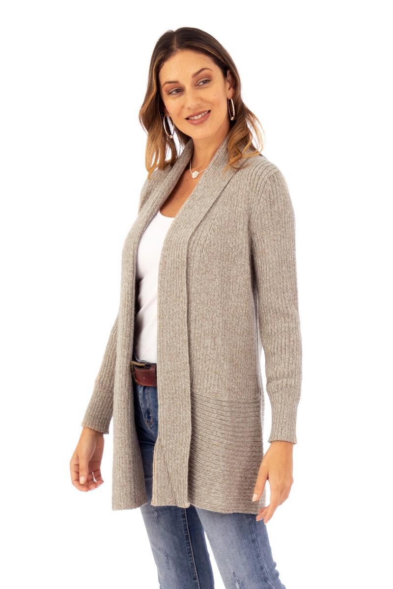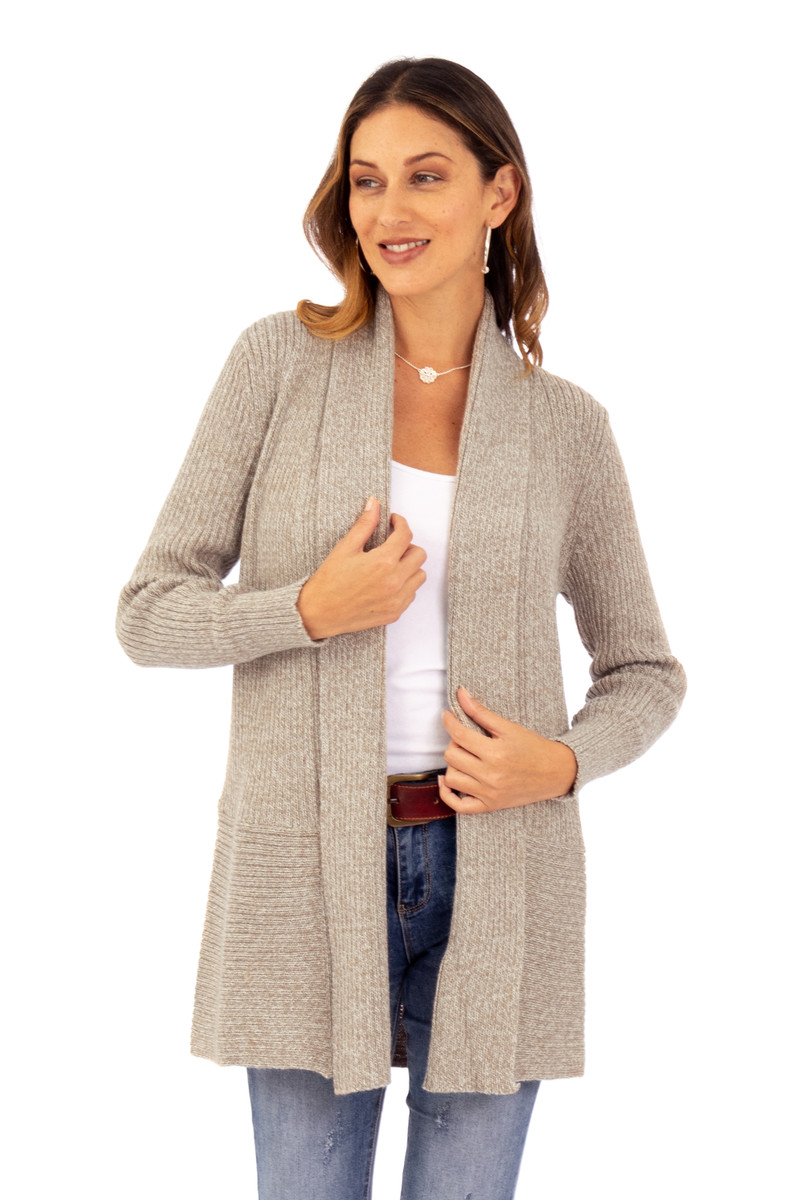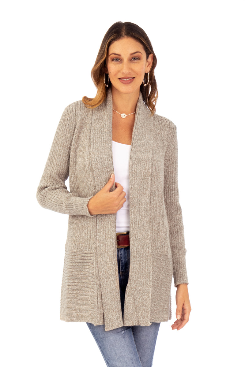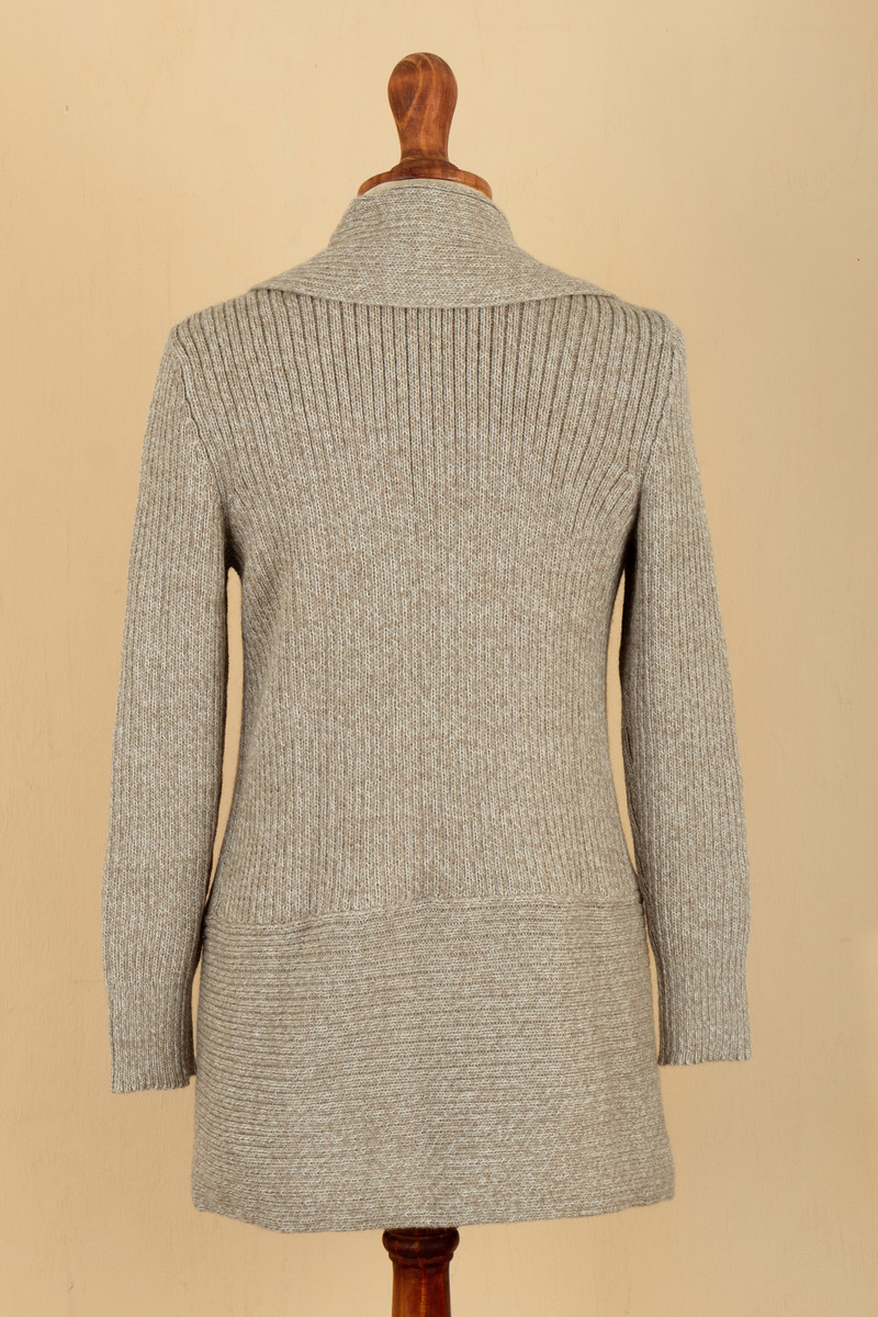 Get warm, cozy and comfortable on those cold winter nights without sacrificing style by wearing this fashionable taupe cardigan crafted in Peru from a soft blend of alpaca, acrylic and wool. The open sweater features wide lapels, long sleeves and horizontal and vertical stripes in a versatile design by artisan Pia Zavala.
