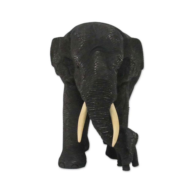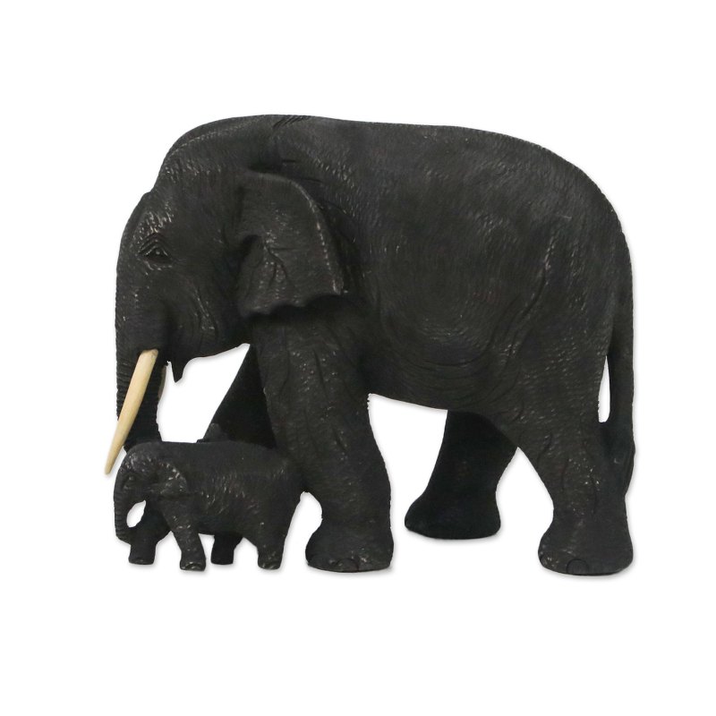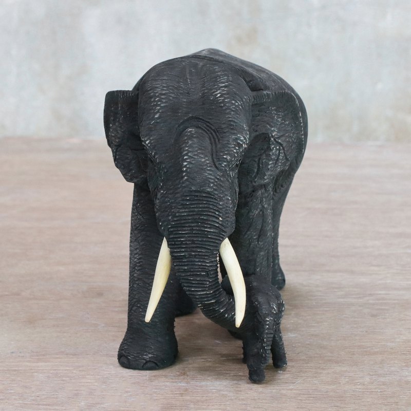 Hand carved in teak wood and ivory darabela wood by Thai artisan Amporn, this piece depicts the sweet and special bond between a mother and child elephant as they walk close to each other. Because these pieces are carved by hand, size and shape may vary slightly.