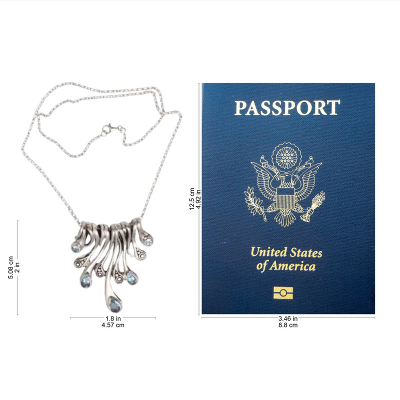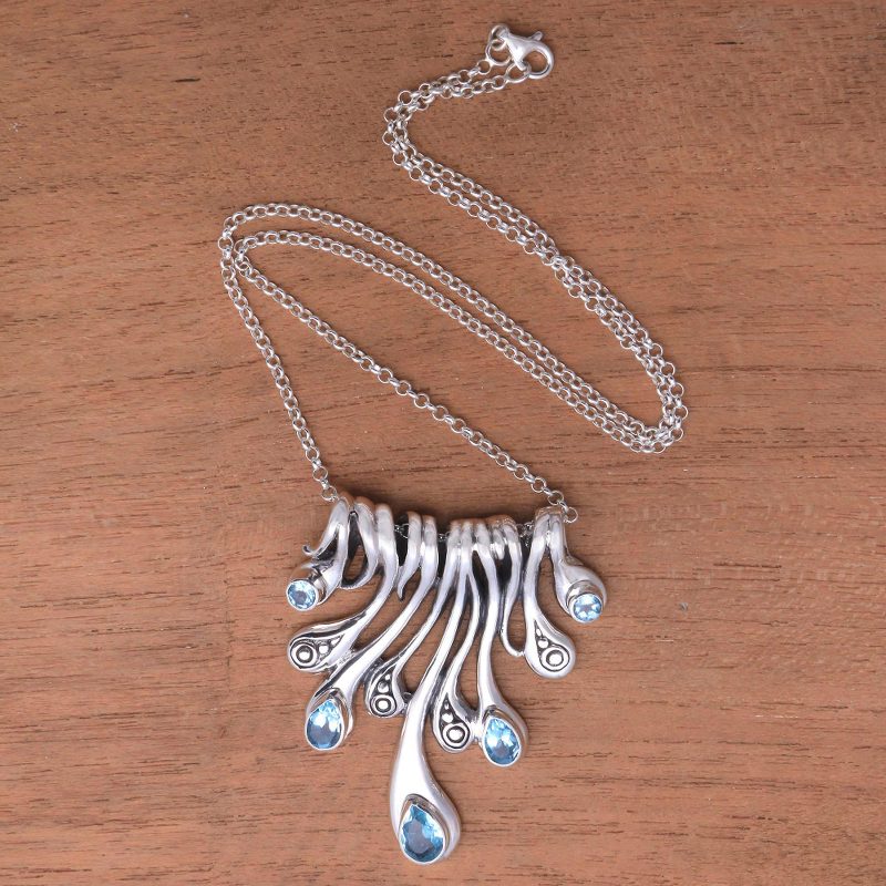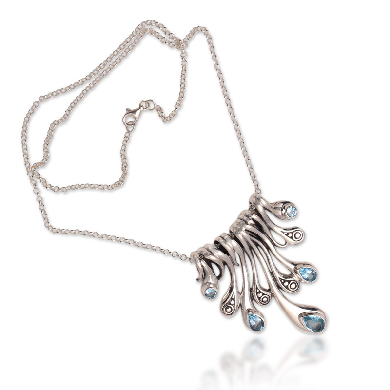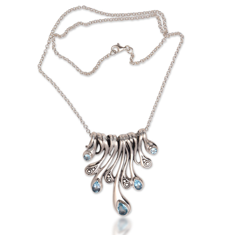 Crafted from sterling silver in a combination of finishes, elegant tendrils culminate in teardrop and round gemstones of blue topaz, totaling over three carats. Balinese artisan Nyoman Rena designs this modern pendant necklace.