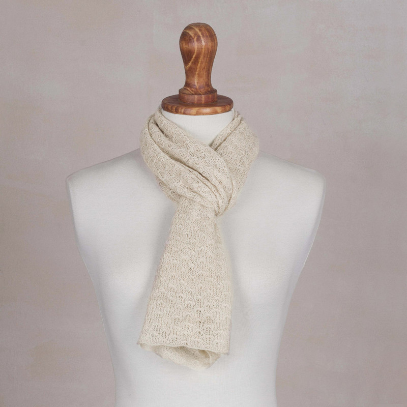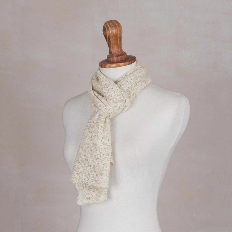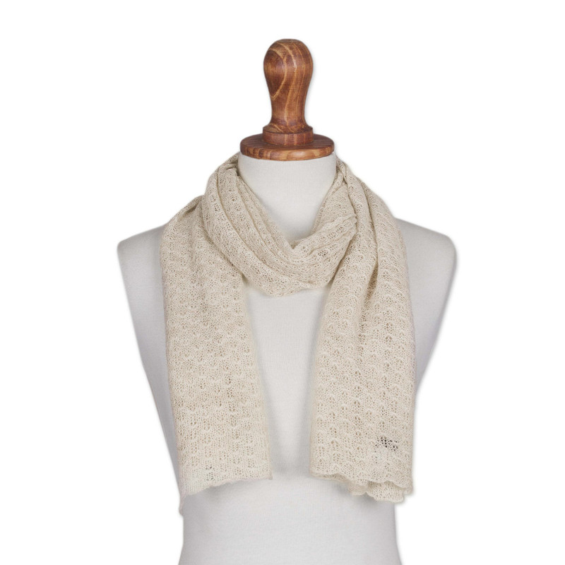 Backed by our Happiness GuaranteeThe wavy texture of this wrap scarf makes it a fashionable companion. Designed by Alfredo Falcon, the scarf is crafted of 100% baby alpaca wool and finished by hand. This elegant scarf features a solid color in champagne for an innocent accessory. Baby alpaca refers to the fine fleece from the season's first shearing.