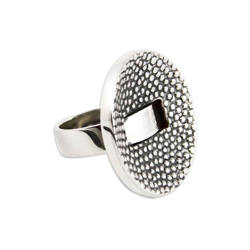 Shining dots populate a dark concave disk. Designed by Carmen Anocibar, this modern silver cocktail ring is crafted by hand. An opening in the crown reveals the polished band.