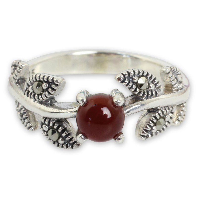 Backed by our 100% Happiness GuaranteeLike a ripe berry, burgundy chalcedony nestles amid sterling leaves. Narinee's handcrafted ring features the sparkle of faceted marcasite.