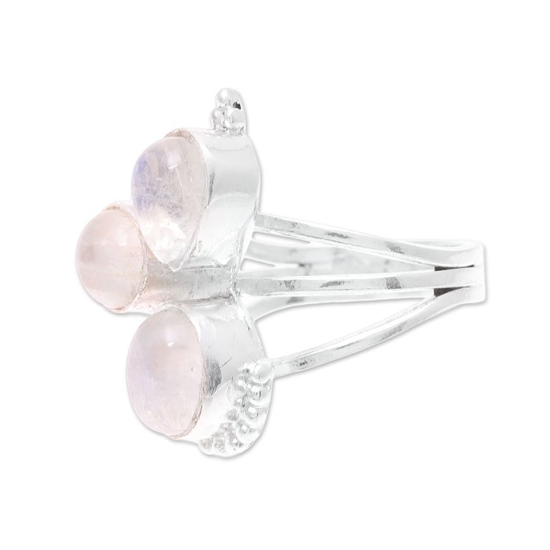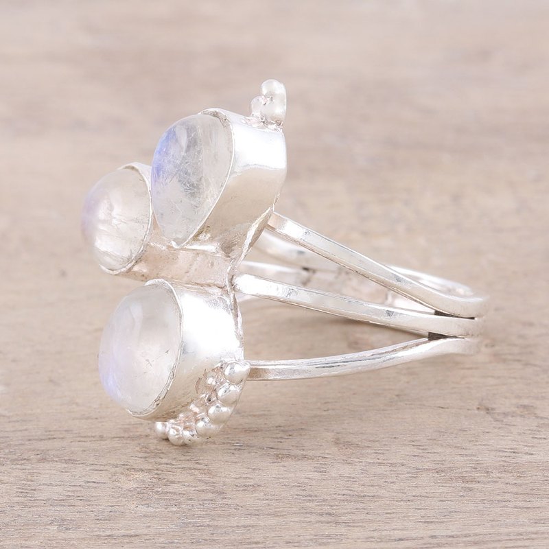 Backed by our 100% Happiness GuaranteeThis Indian cocktail ring has a triple array of rainbow moonstone for triple the elegance. Designed by Pawanesh Gupta, the ring circles the finger with three bands of sterling silver that culminate in an elaborate handcrafted crown.