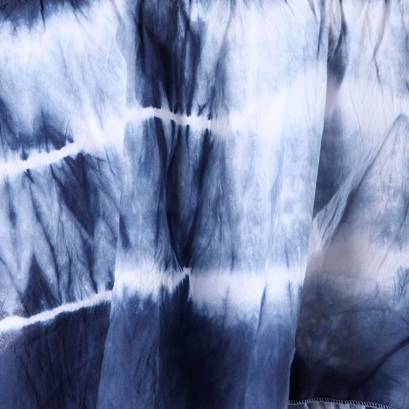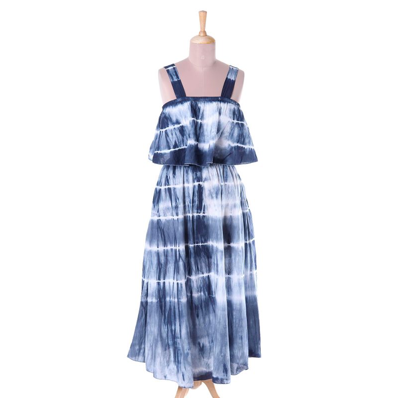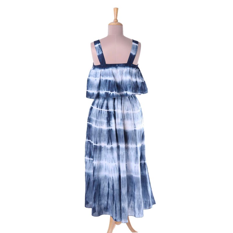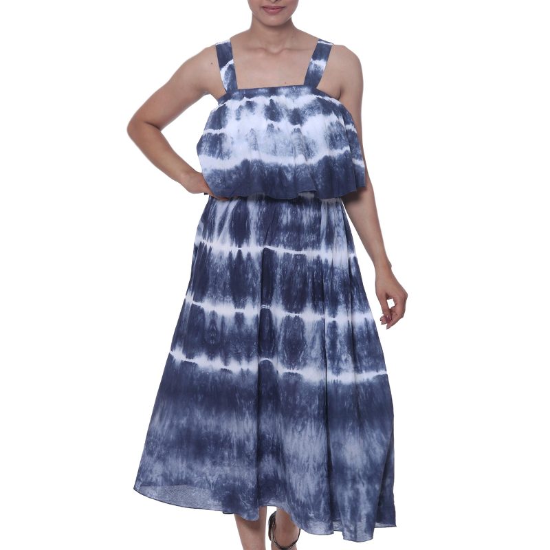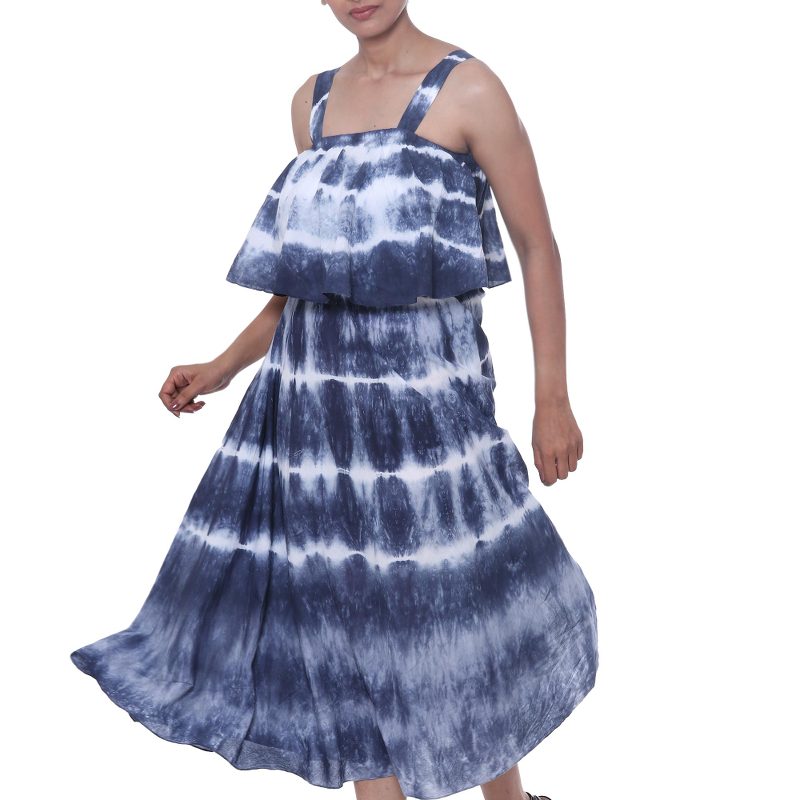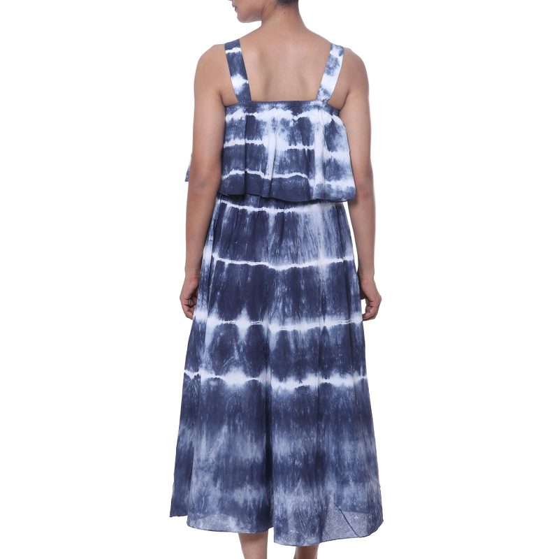 By Indian artisan Shashi Sehgal, this stunning dress invites you to a summer fantasy. Featuring a pleated top, the dress is decorated with navy blue tie-dyed motifs that create fascinating stripes in white.