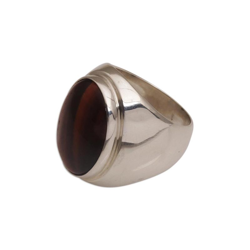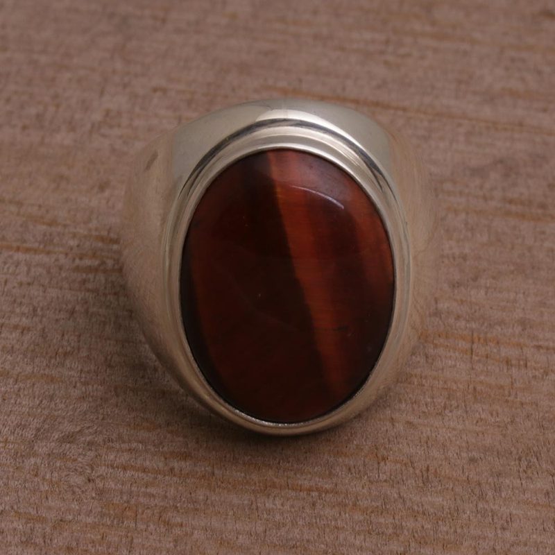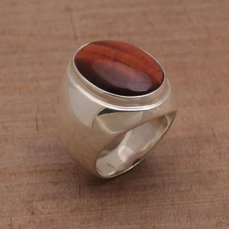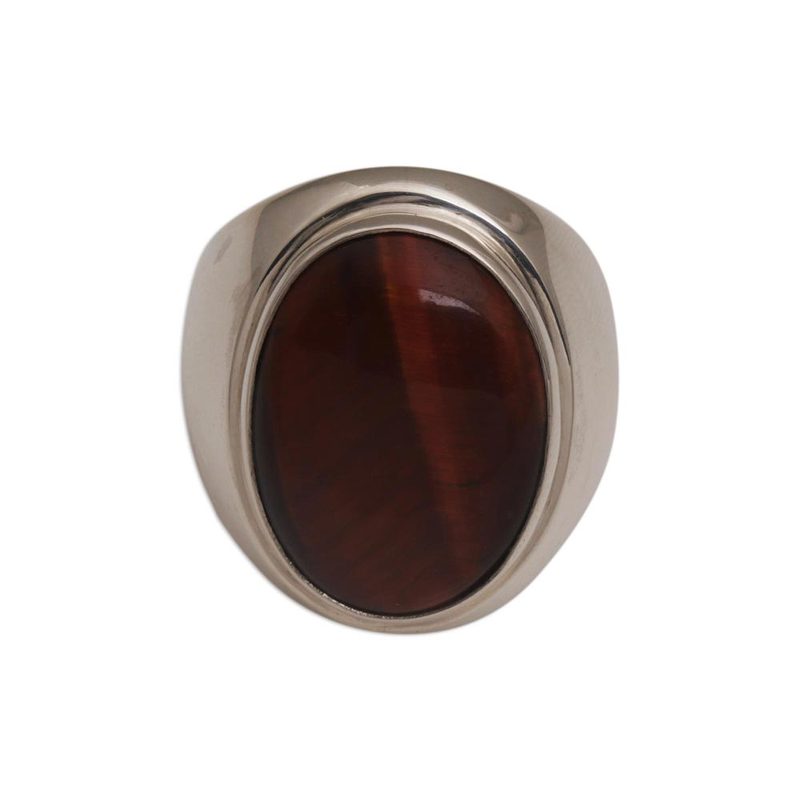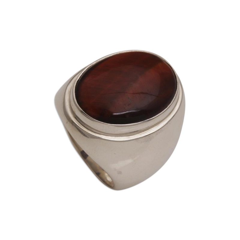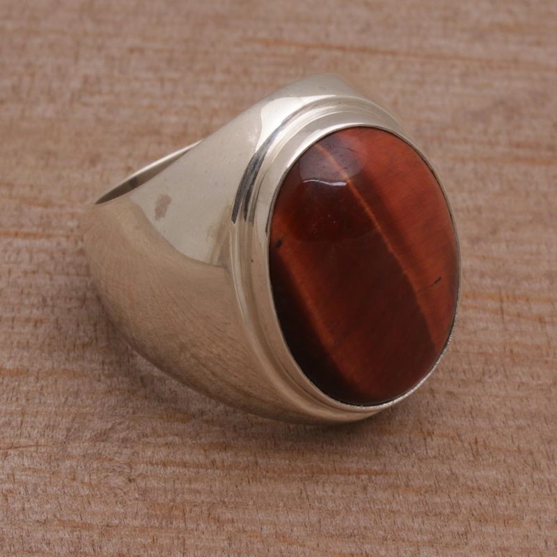 A tapered band of high-polish sterling silver that circles the finger is crowned with an oval cabochon of tiger's eye. Sharing a special bond with gemstones, Balinese artisans design the ring for the Mutiara Collection, inspired by the glamour of the stone.