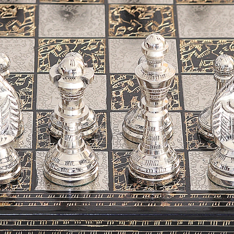 The ancient battle between two minds takes a unique turn: India's Tulsi Dass draws inspiration from his beloved Rewari to create a stunning chess set embellished with traditional motifs. Crafted from brass, each piece features a high-quality finish in a luxurious palette of black and metallic tones. On top of that, a wooden red box allows you to store the game securely thanks to its polyester lining and sturdy brass-plated iron fixtures.