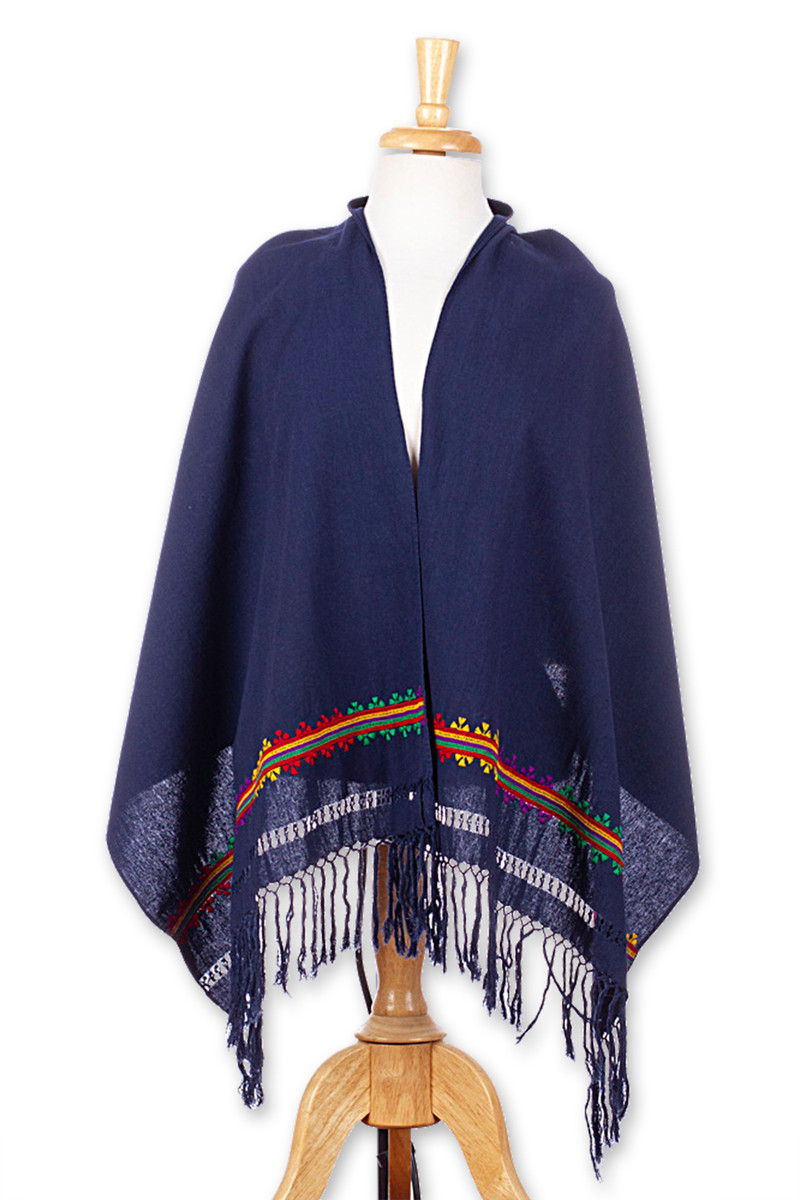 Petrona Patishtan makes an homage to her beloved Mexican culture with a handloomed garment made entirely from cotton. Featuring playful fringes, this shawl comes in a stylish midnight tone, with traditional embroidered details in a palette of red, yellow, green and purple tones.