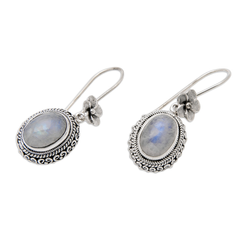 Mystic hues add a heavenly touch to this precious accessory inspired by Bali's nature. Artisan Buana proudly displays an enchanting sterling silver work featuring the region's classic style and frangipani blooms, all forming a pair of graceful dangle earrings with a polished finish. Radiant and glamorous, the pieces are crowned with natural rainbow moonstones, whose charming light symbolizes harmony.