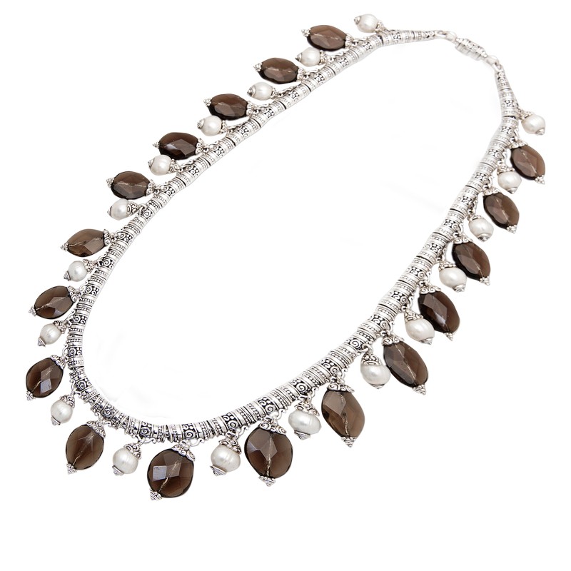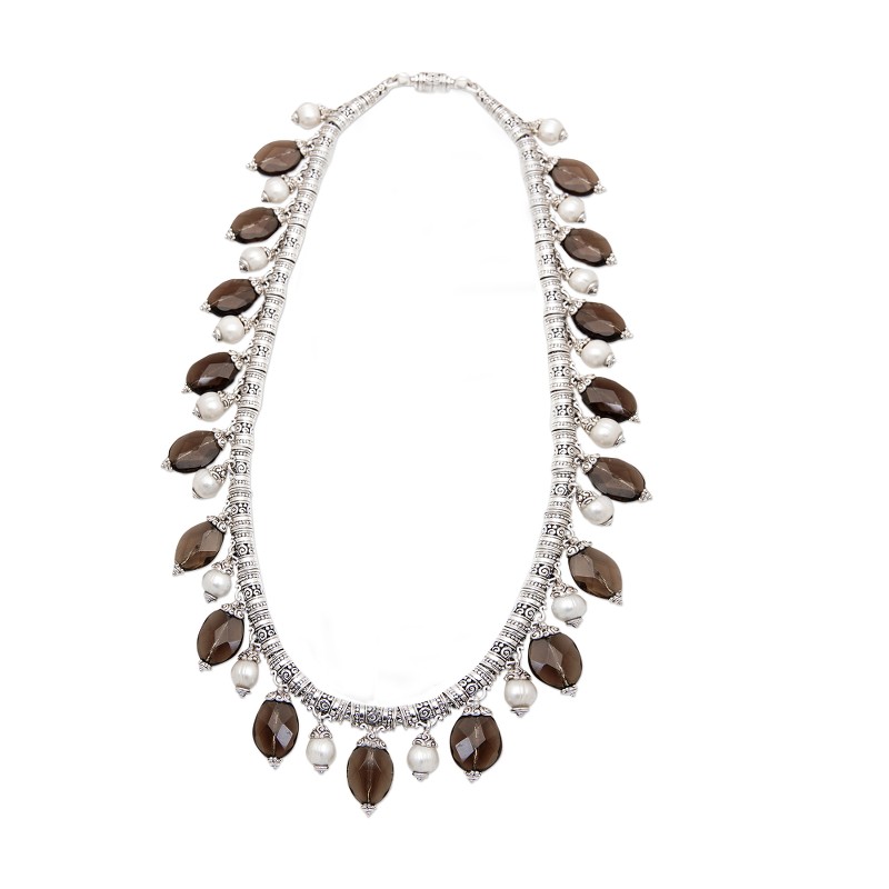Sterling silver beads decorated with traditional Balinese motifs embellish the structure of this stunning design in honor of the region's customs. Crafted by Zayd Makarim, this beaded necklace features smoky quartz stones and cultured pearls dangling gracefully between each bead, creating a glorious illusion that combines dark and luminous hues.