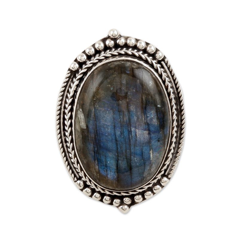Backed by our 100% Happiness GuaranteeAncient legends tell of mystic rocks that used to hide the Northern Lights in their sturdy interiors. These legendary stones are what we now know as labradorite, the same jewel that today embellishes Rakesh Rana's newest creation. Working in India, the artisan creates a gorgeous sterling silver structure with braided and beaded motifs in a polished finish, setting a natural labradorite cabochon in this cocktail ring with gleaming light.