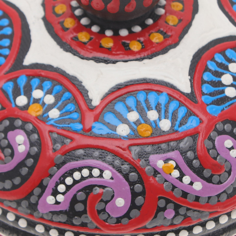 Backed by our 100% Happiness GuaranteeThailand's arts and magnificence decorate Pang and Ni's newest creation, made for those environments with a glamorous aura. Applying advanced woodworking techniques to a sturdy mango wood piece, the team handcrafts this round decorative box. After polishing the surface, their creative side emerges with an intricate pattern of classic motifs in a palette of red, blue and purple hues, topped with little beads tied to the lid with a waxed cotton cord.