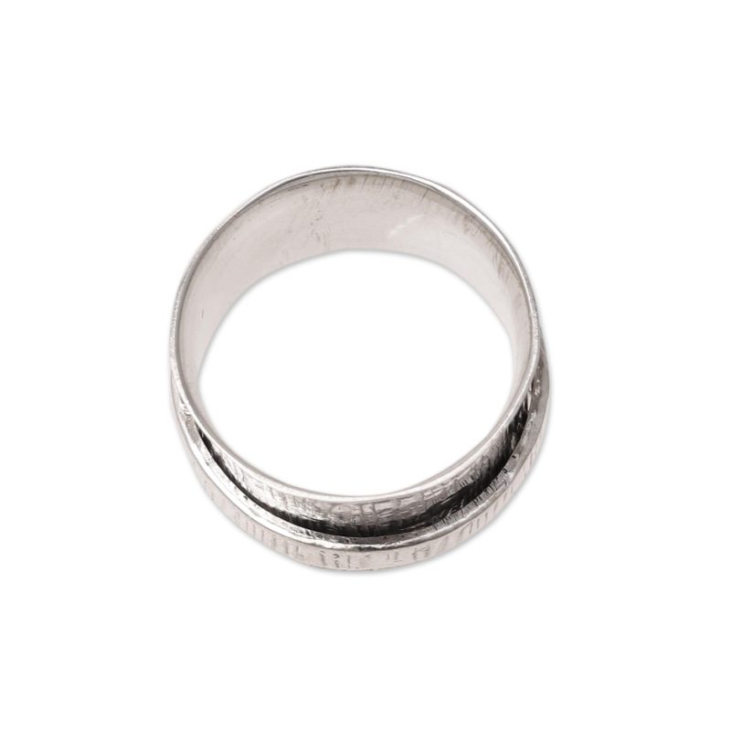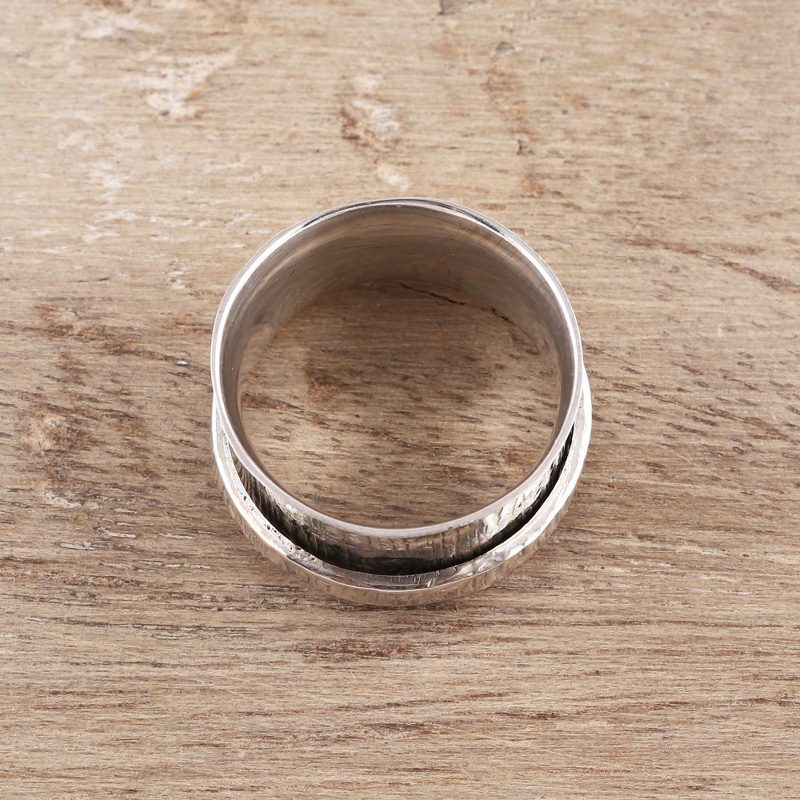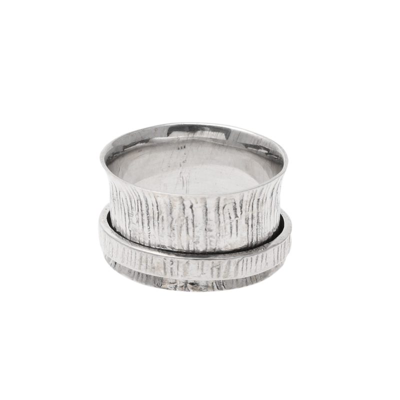Resembling a tree trunk, beautiful patterns in a combination of finishes decorate this spinner ring from India. Shivani Choudhary designs this ring.