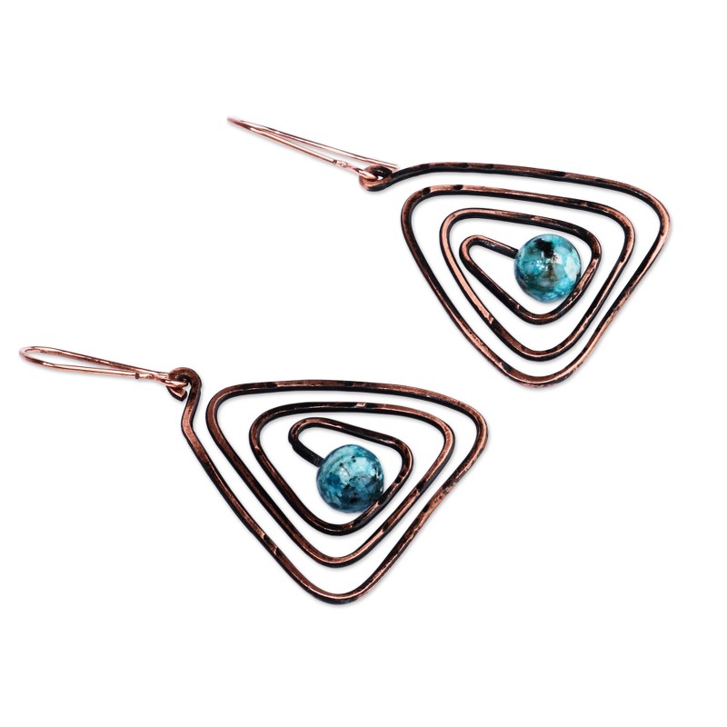 Classic triangles showcase a hypnotic path that leads you to the light of natural jade stones, whose spiritual energy conquers these copper dangle earrings by Armenia's Tsovinar Gasparyan. Made to resemble a labyrinth, these antique-finished accessories evoke the grace of the region's ancient era, which makes them perfect for any occasion.