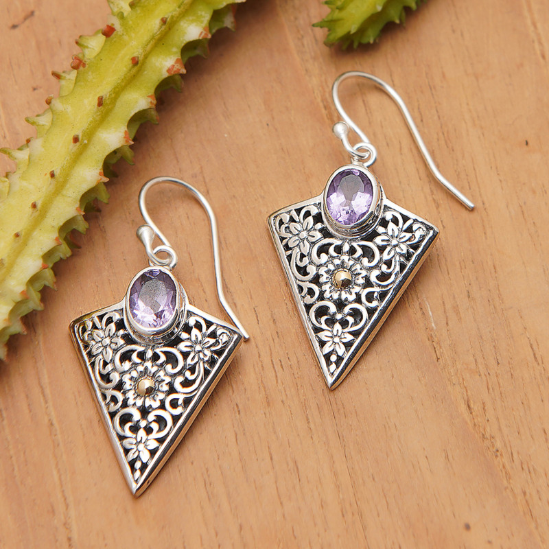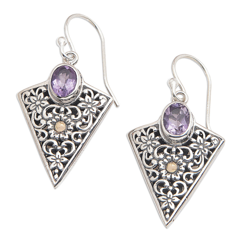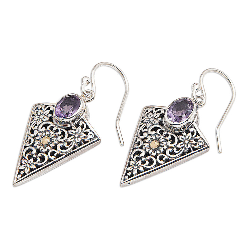 Shield-like triangles bear florid openwork designs in earrings from Kadek Wijanegara in Bali. The dangle earrings are crafted from sterling silver with 18k gold accents and set with 1.5 carats of luscious amethyst.