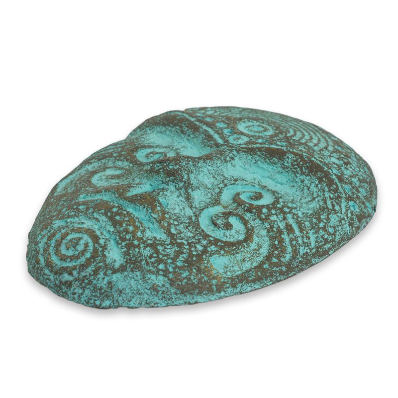 Taking a cue from the elaborate masks worn by many cultures around the world, Thai artisan Somyot Sawasdee creates the original design of this mask with intricate tribal markings. He recycles paper with cement and finishes the wall mask with green and gold paint, creating the illusion of an aged bronze piece. Features a hook on the back.