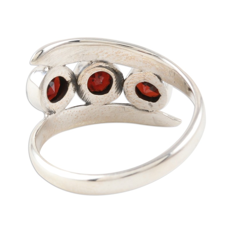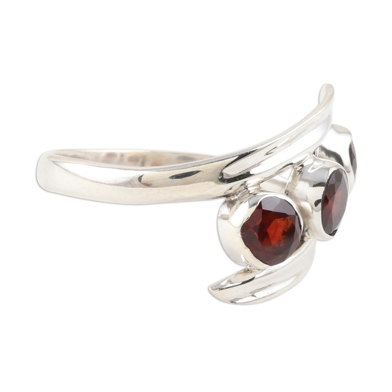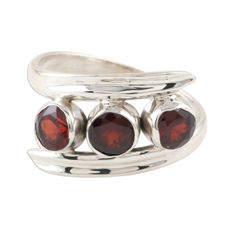Showcasing three round-cut garnet gems, this ring from Rakesh Rana in India will capture admiring glances. The gems are set in polished sterling silver between both ends of a slender, shapely band.