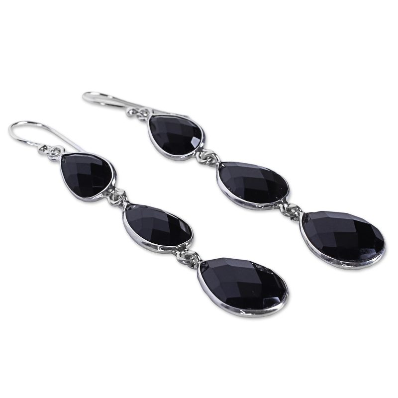 The magical elegance of onyx shines through in these mesmerizing dangle earrings presented by Alok Jain of India. Three checkerboard-faceted black onyx teardrops are suspended vertically from sterling silver hooks. The hooks and settings feature a high polish finish that dazzles.